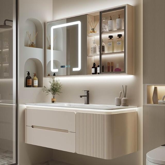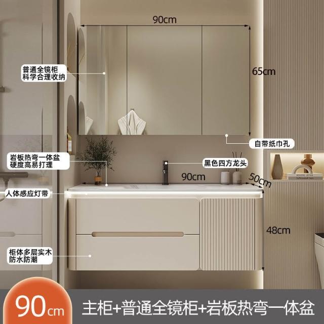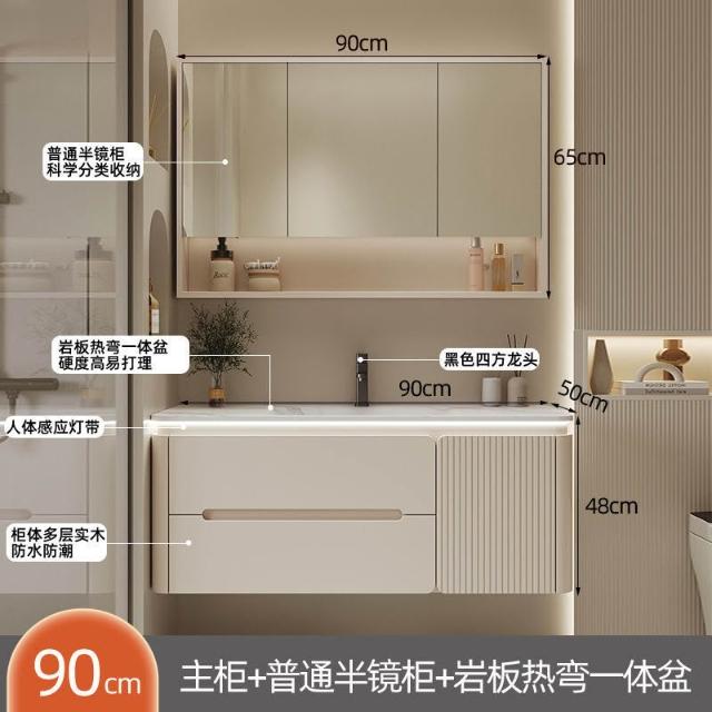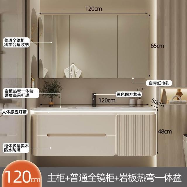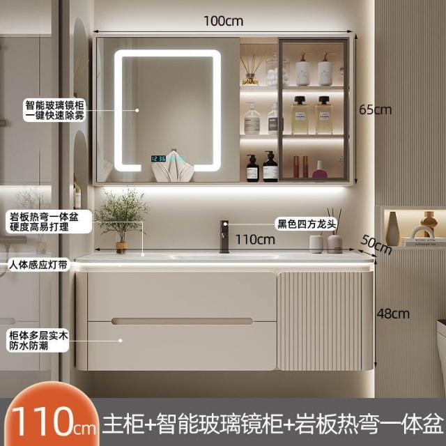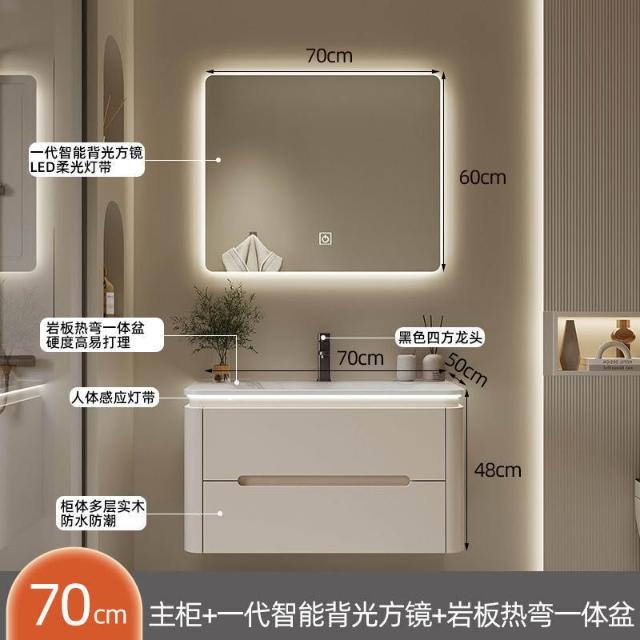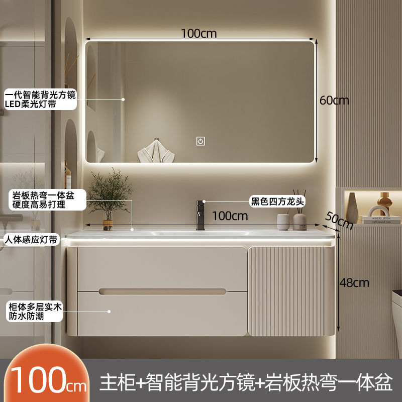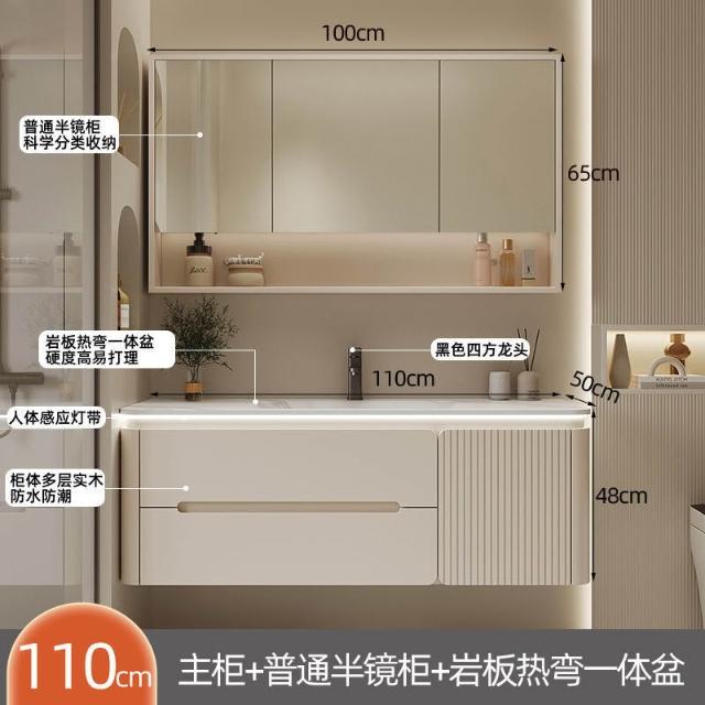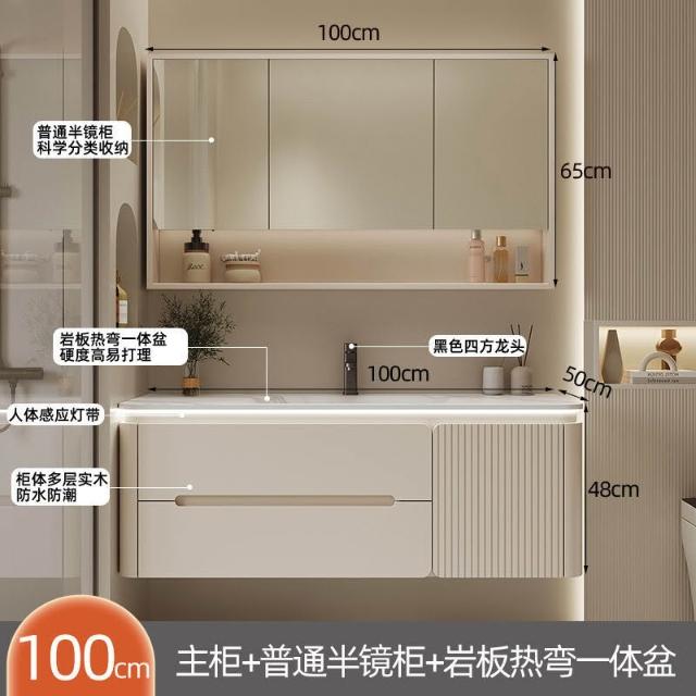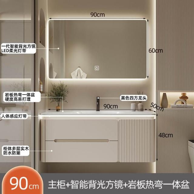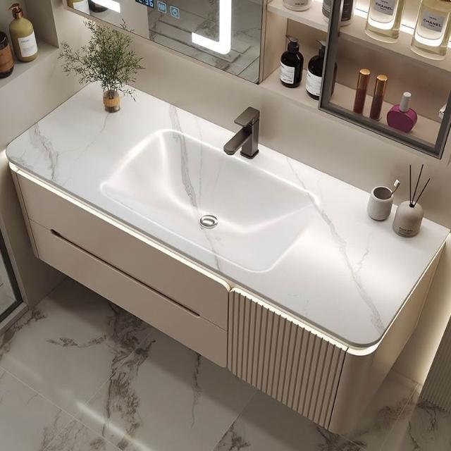 幕辭家居 圓角巖板熱彎一體衛生間奶油浴室櫃洗手洗手盆洗臉盆洗漱鏡櫃組合 fbd