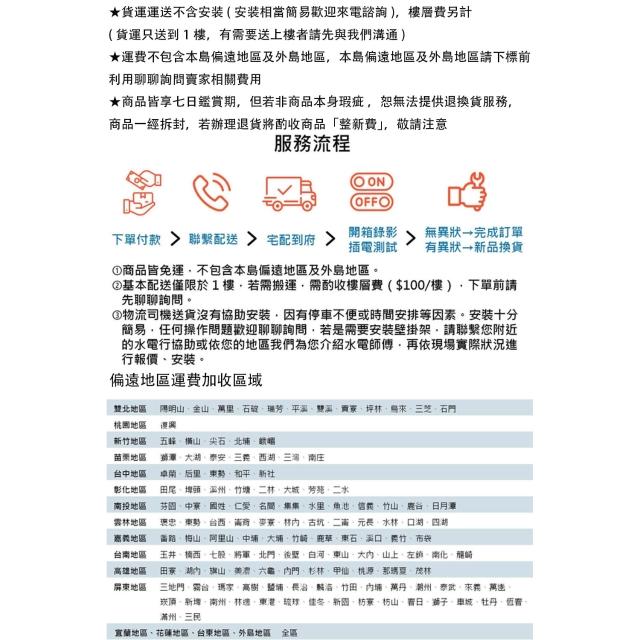 • 針對大型商品(包括:大型家電、家具床墊、健身按摩器材、車類...等),商店將於完成收款確認後,一天內〈不含例假日〉將會有專人與您確認相關配送細節等的聯繫。偏遠地區、樓層費及其它加價費用,皆由商店於約定配送時一併告知,商店將保留出貨與否的權利。