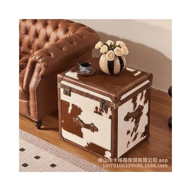 ✨廠家直銷✨ 美式復古邊几桌子 奶牛皮牛仔箱包 儲物櫃 客廳邊几 房間床頭櫃 皮箱茶幾 法式中古風收納櫃
