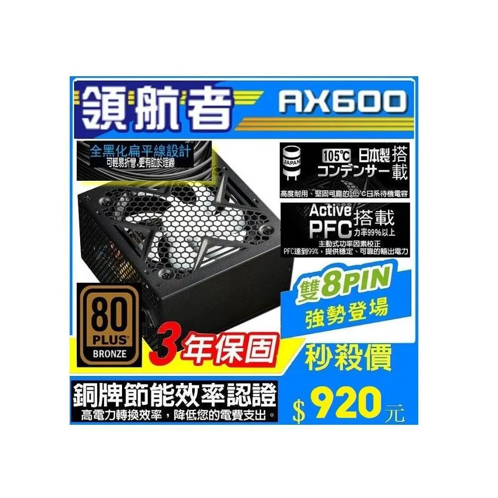 銅牌80+ 3年保固 領航者 600 銅牌 電源供應器 雙8pin 日系電容 POWER 扁線 電腦天堂