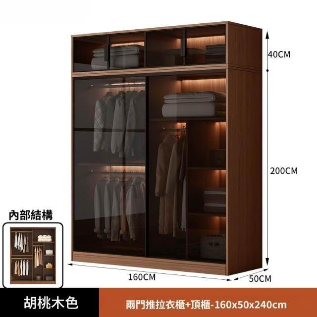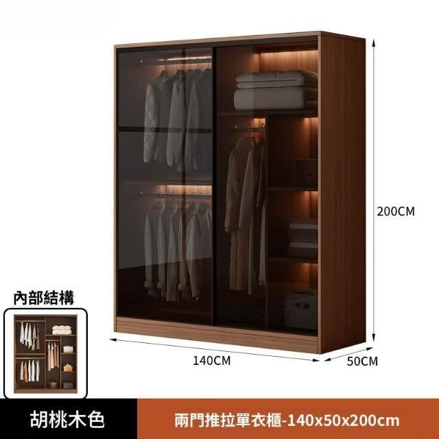推拉移門胡桃色高級感玻璃門大衣櫃家用臥室實木現代簡約輕奢透明