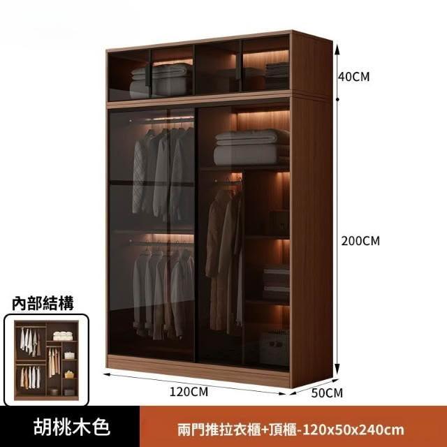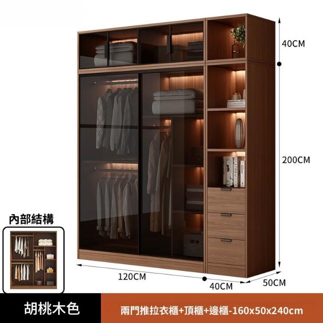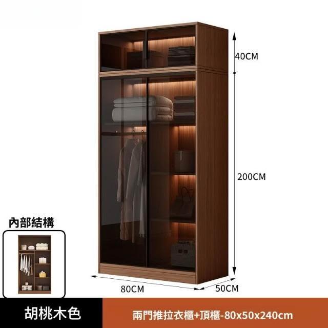 推拉移門胡桃色高級感玻璃門大衣櫃家用臥室實木現代簡約輕奢透明