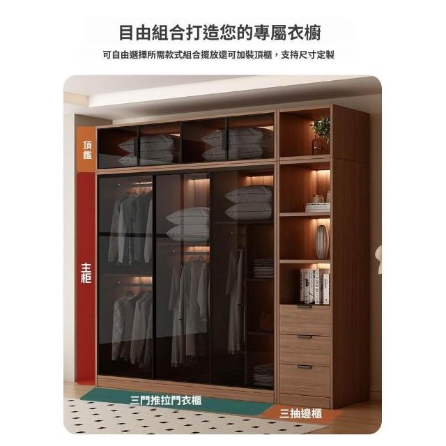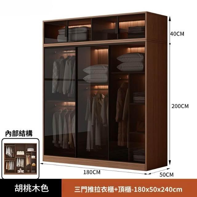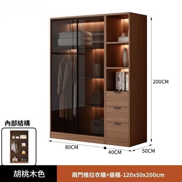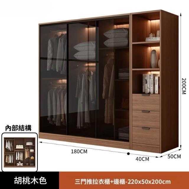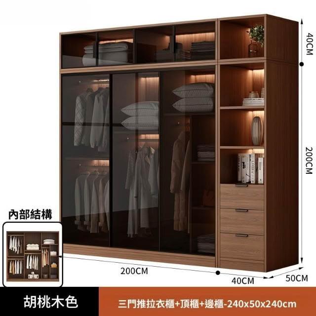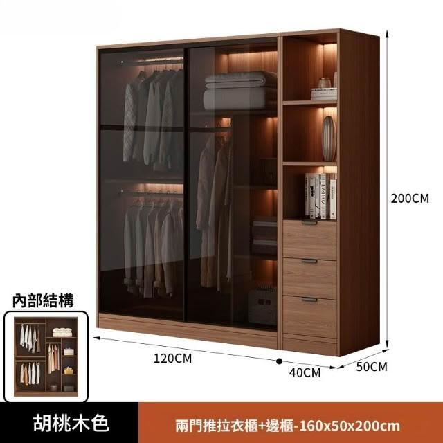 推拉移門胡桃色高級感玻璃門大衣櫃家用臥室實木現代簡約輕奢透明