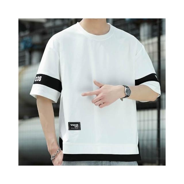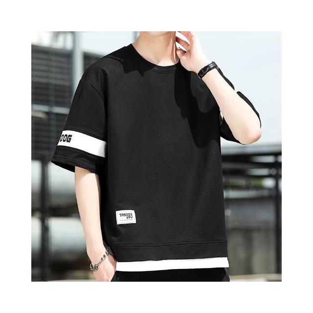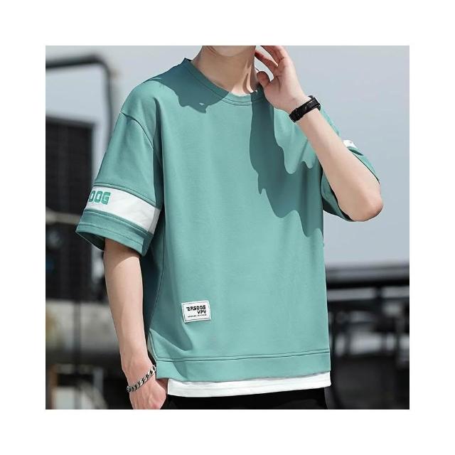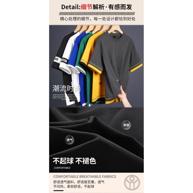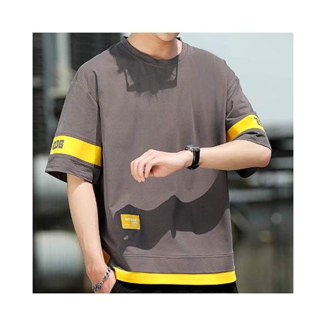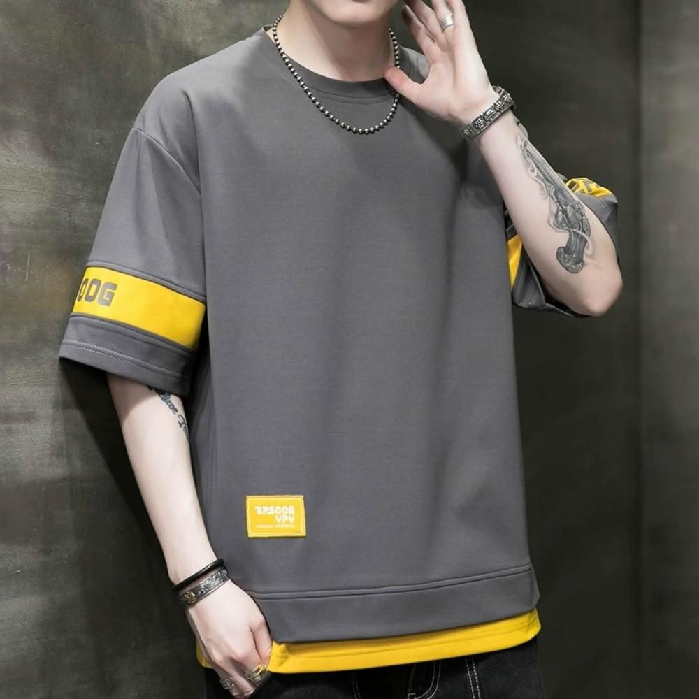 T恤男假兩件短袖t恤男生拼接半袖衫青少年時尚百搭舒適上衣夏季潮牌休閒服夏天寬鬆透氣繡花印章防皺圓領灰色短t涼感衣男裝上衣