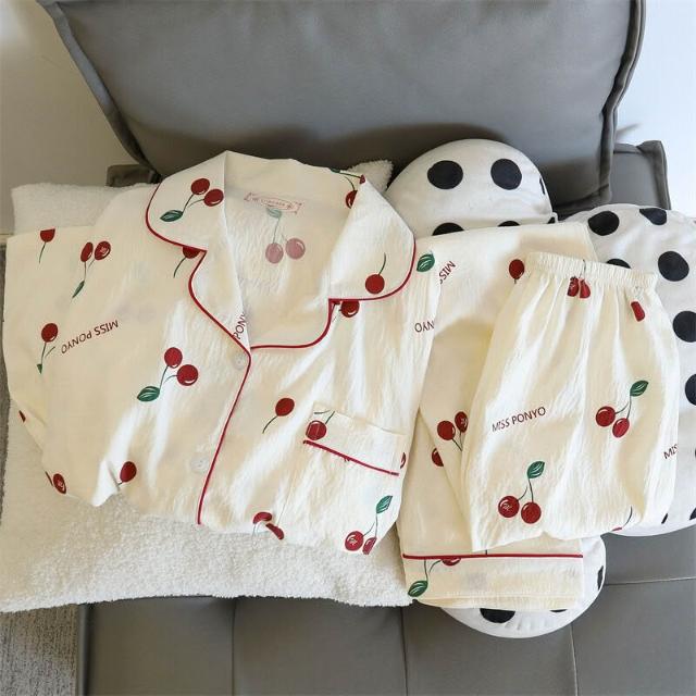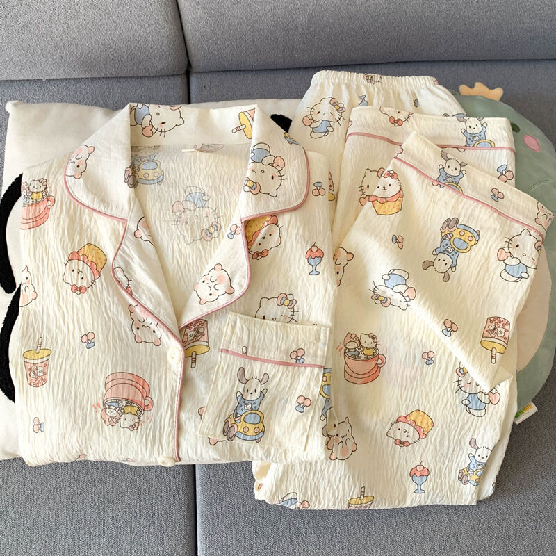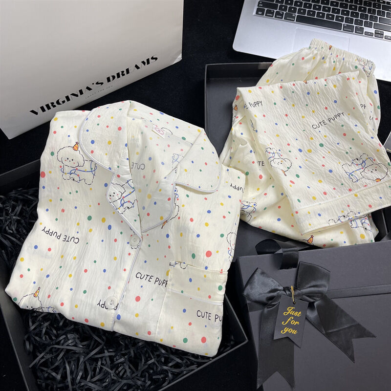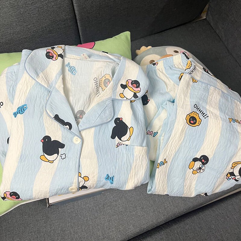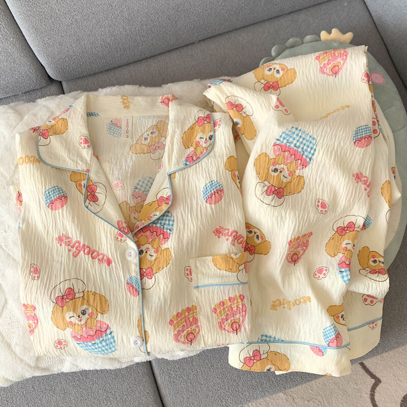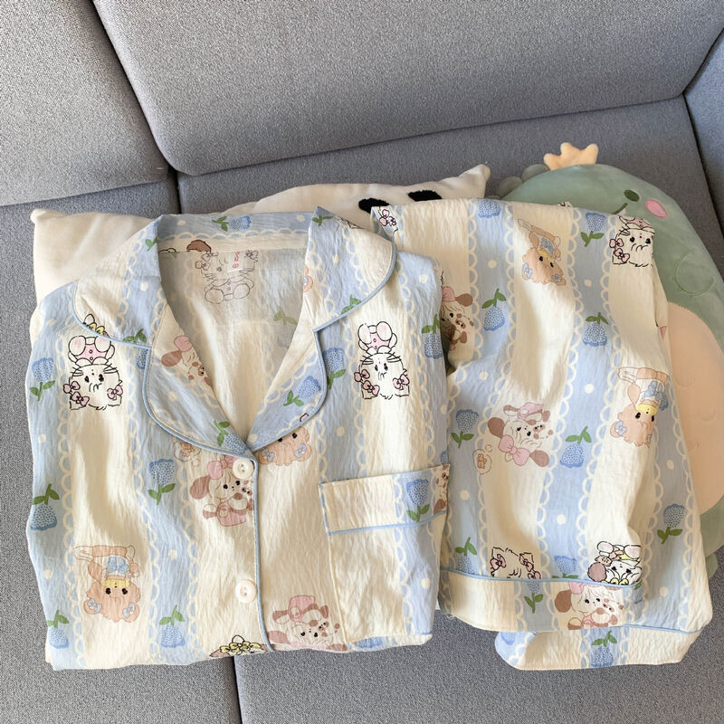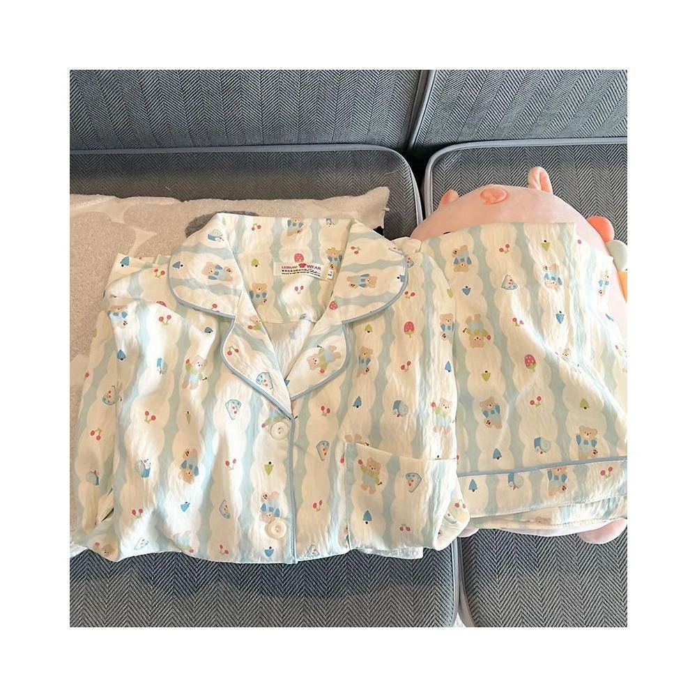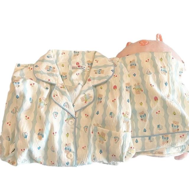 藍色小熊睡衣女款 春秋夏季雲朵棉長袖長褲 卡通可愛外穿套裝 家居服