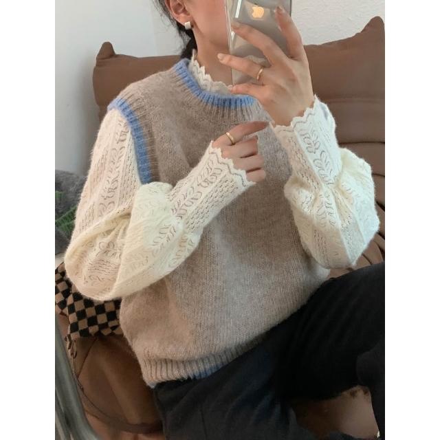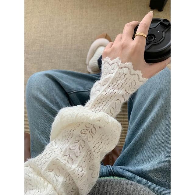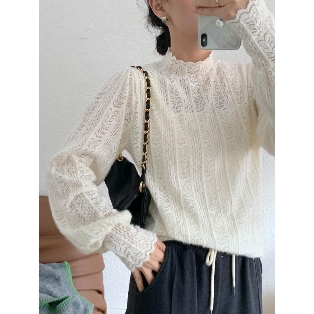 奈看服飾 法式絨感蕾絲半高領泡泡袖花邊氣質百搭長袖 小香風氣質長袖內搭 上衣 小香風