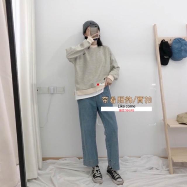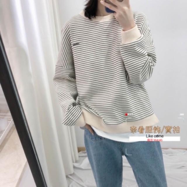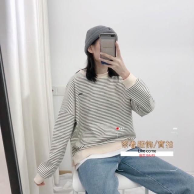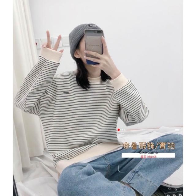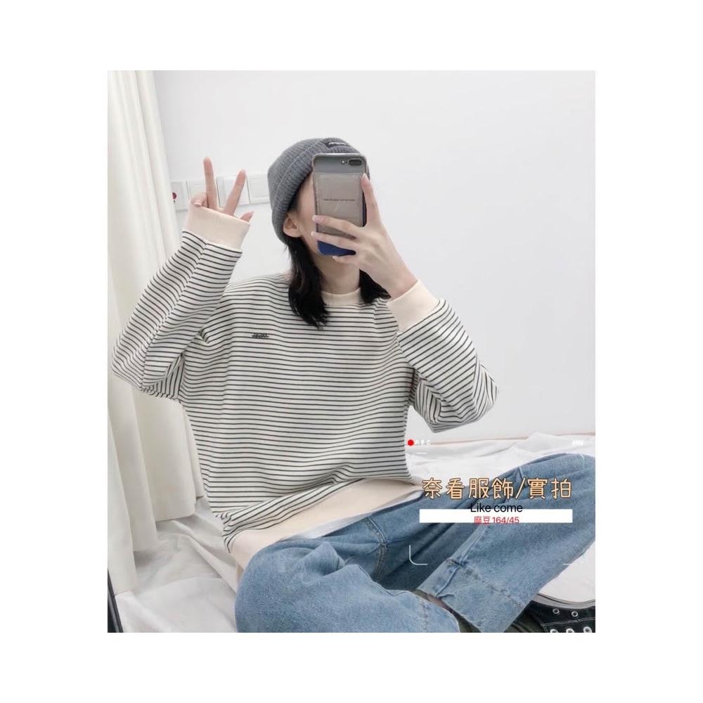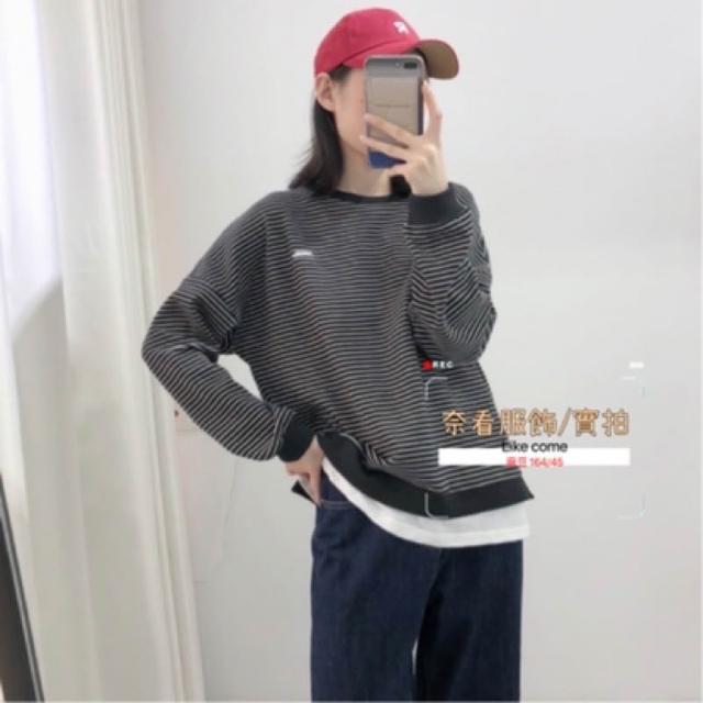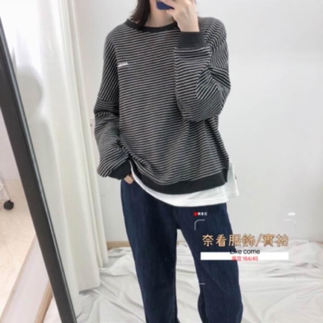 奈看服飾 經典細條紋假二件大學T 黑白二色