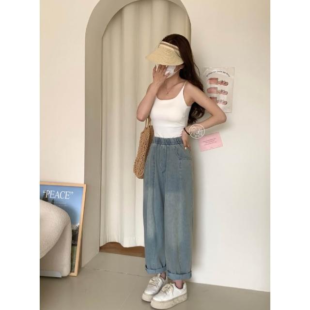 奈看服飾 實拍水洗軟牛仔布料舒服奶奶褲 不黏不膩寬鬆好感牛仔寬褲鬆緊腰 抓鄒設計感 牛仔褲 9分褲