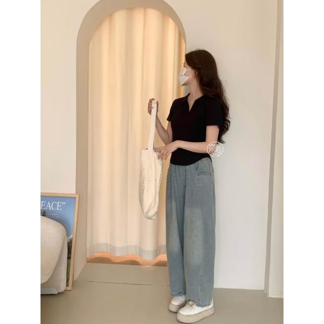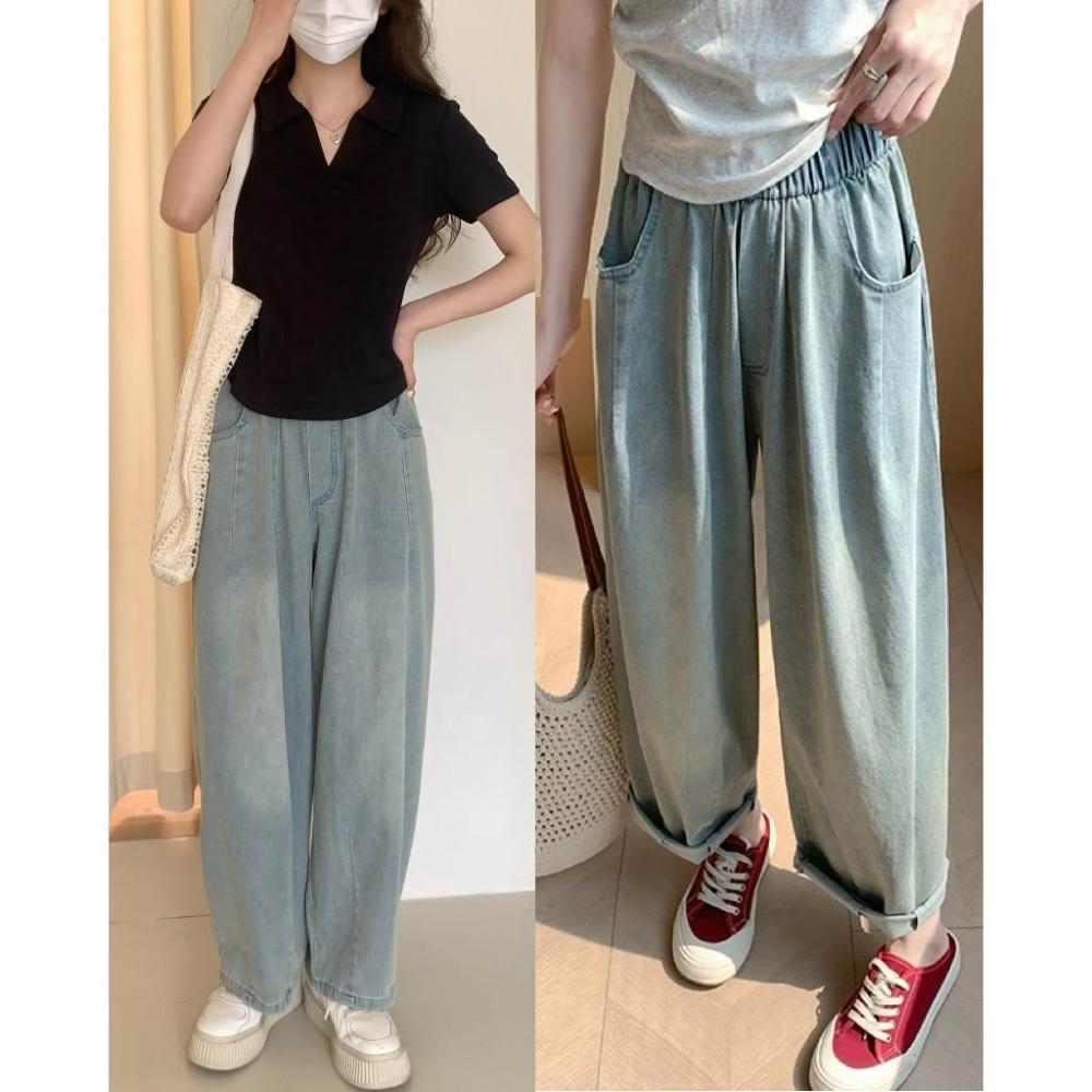 奈看服飾 實拍水洗軟牛仔布料舒服奶奶褲 不黏不膩寬鬆好感牛仔寬褲鬆緊腰 抓鄒設計感 牛仔褲 9分褲