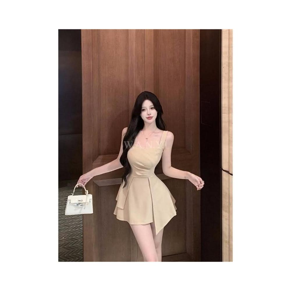 𝐖𝐀𝐍𝐘𝐈 ⧓小香風氣質褶皺吊帶連衣裙不規則顯瘦短裙無袖收腰a字裙