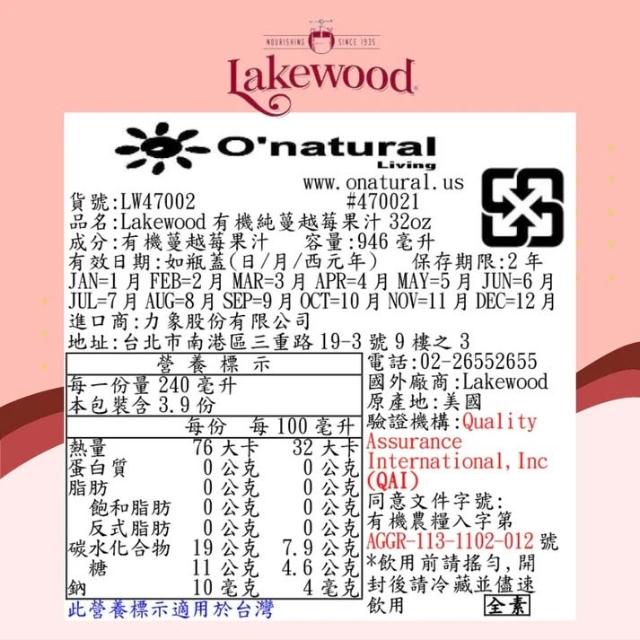 Onatural歐納丘 有機純蔓越莓汁 946mlx1瓶