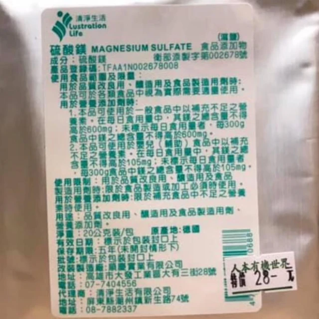 清淨生活 硫酸鎂/瀉鹽 20gx1包(通過衛生福利部食品添加物檢驗合格)