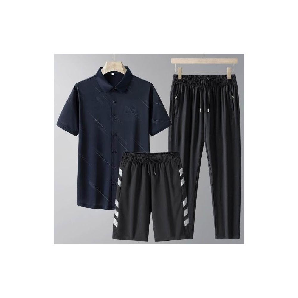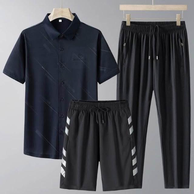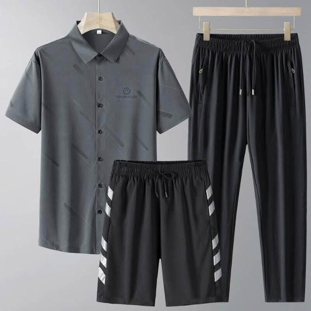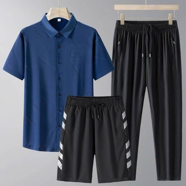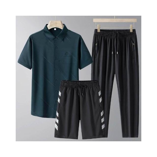 運動套裝男polo衫短袖上衣大尺碼涼感衣短褲吸濕排汗衣薄冰絲短袖T恤褲子男生登山透氣速乾褲子休閒套裝高爾夫球衣羽球衣服 夏天寬鬆t恤男裝跑步健身衣五分寬褲運動長短褲三件式套裝居家舒適套裝防曬長褲中年爸爸三件套
