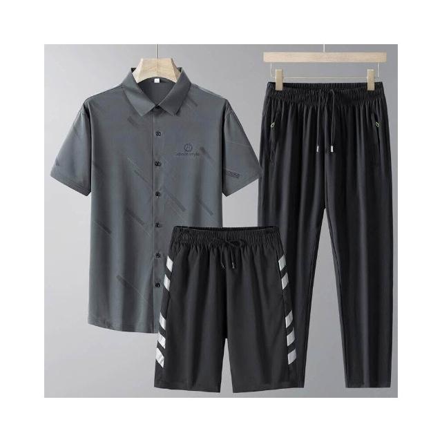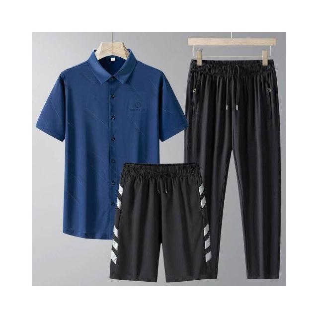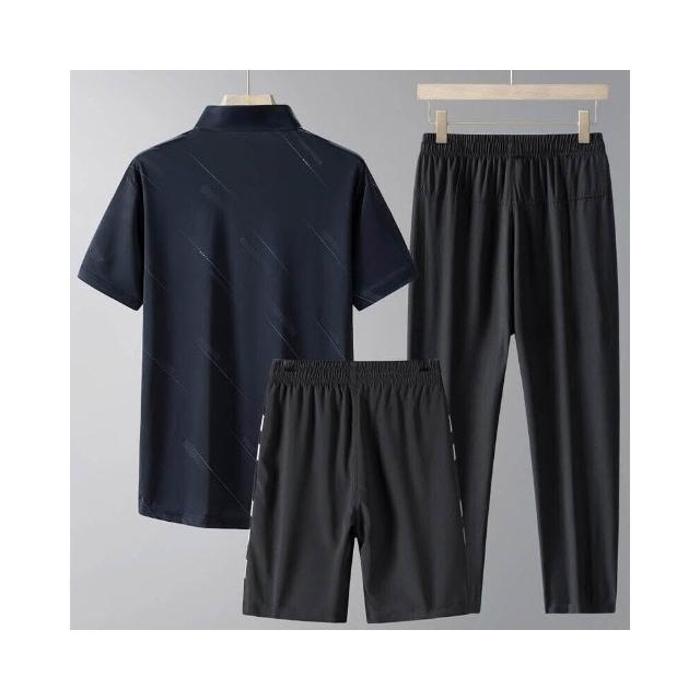 運動套裝男polo衫短袖上衣大尺碼涼感衣短褲吸濕排汗衣薄冰絲短袖T恤褲子男生登山透氣速乾褲子休閒套裝高爾夫球衣羽球衣服 夏天寬鬆t恤男裝跑步健身衣五分寬褲運動長短褲三件式套裝居家舒適套裝防曬長褲中年爸爸三件套