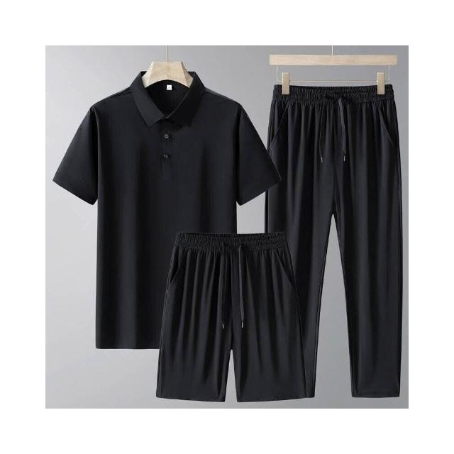 運動套裝男polo衫短袖上衣大尺碼涼感衣短褲吸濕排汗衣薄冰絲短袖T恤褲子男生登山透氣速乾褲子休閒套裝高爾夫球衣羽球衣服 夏天寬鬆t恤男裝跑步健身衣五分寬褲運動長短褲防曬褲三件式套裝居家舒適套裝中年爸爸三件套