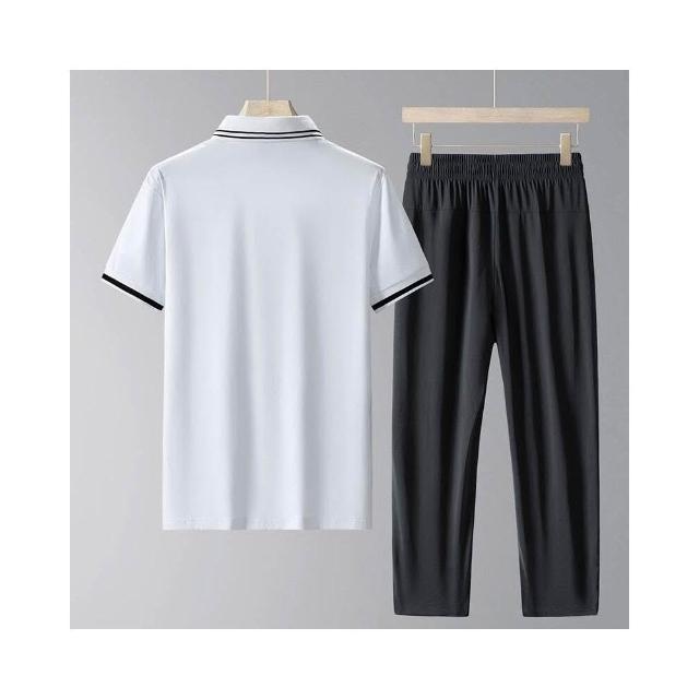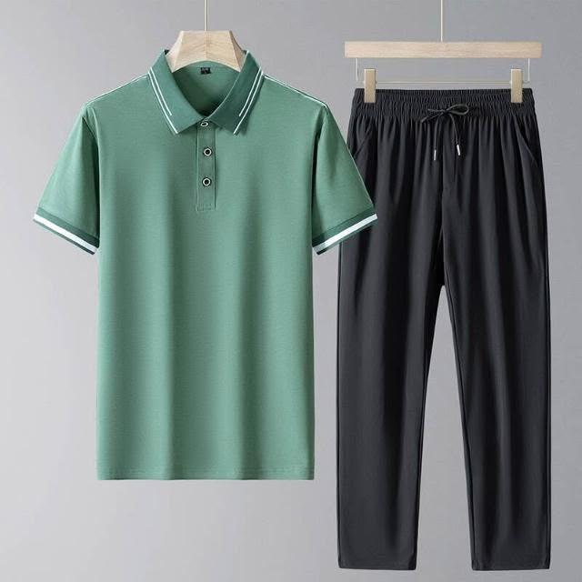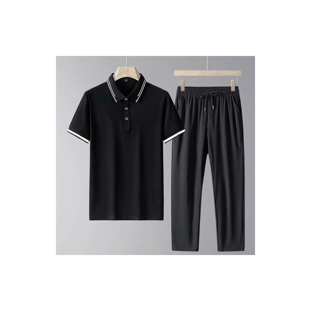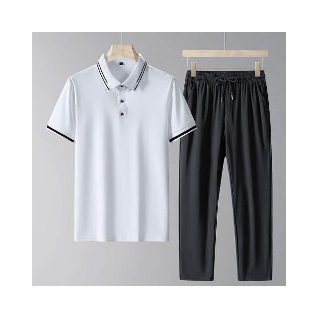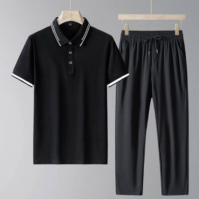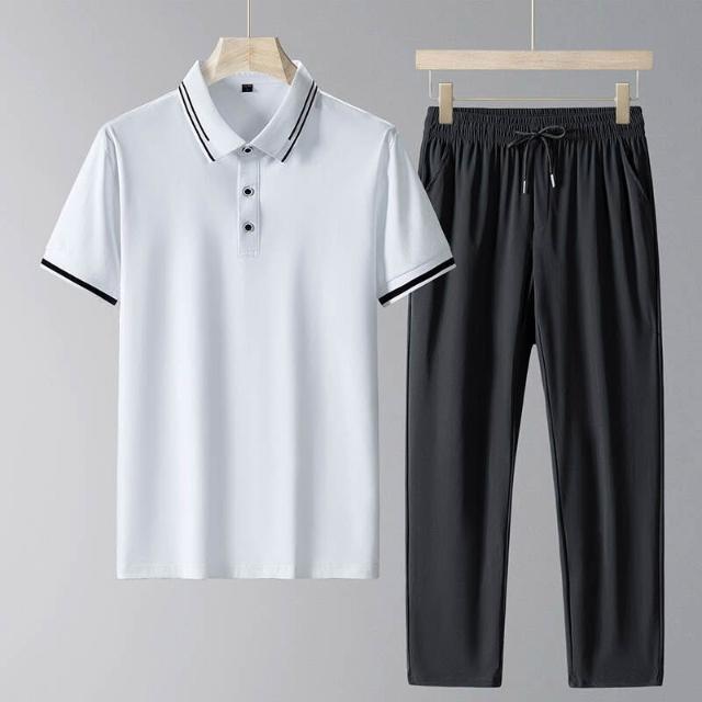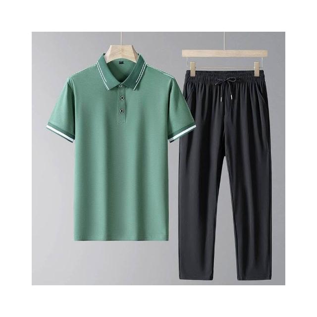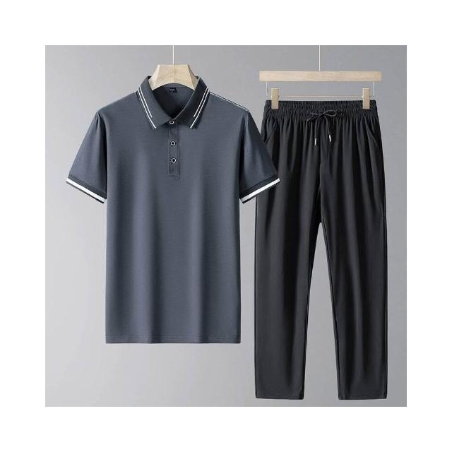 運動套裝男polo衫短袖上衣大尺碼涼感衣長褲薄吸濕排汗衣冰絲短袖T恤褲子男生休閒套裝羽球衣服高爾夫球衣登山透氣速乾長褲 中年男裝爸爸兩件套居家舒適套裝跑步健身衣防曬褲運動男寬褲夏天寬鬆t恤兩件式套裝