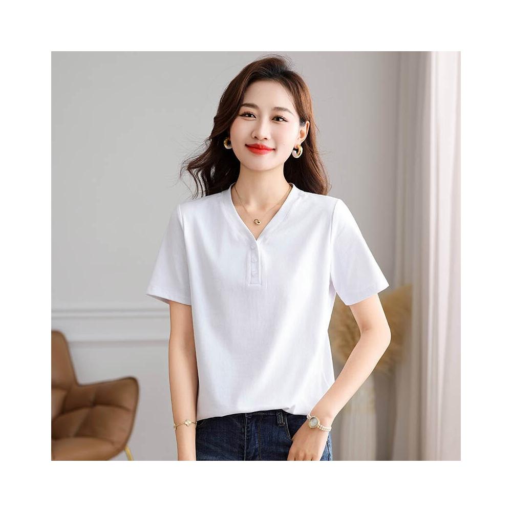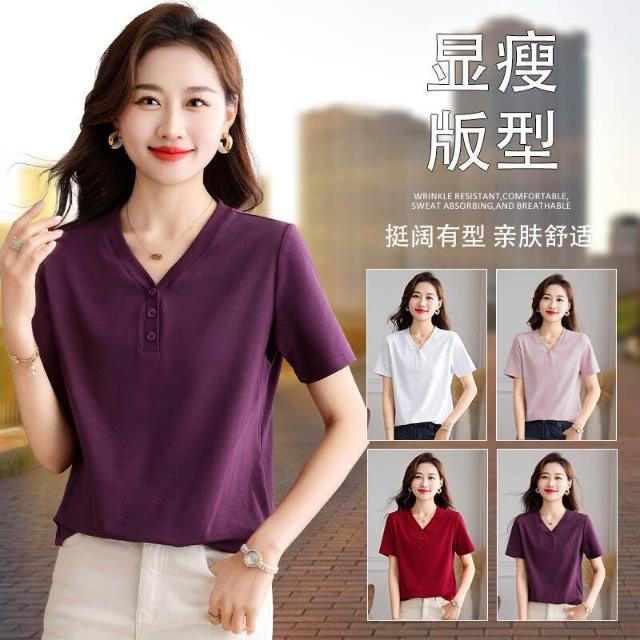短袖上衣女夏季大尺碼輕薄V領修身短袖T恤彈力舒適透氣吸濕速幹排汗耐磨短袖寬鬆耐磨遮肉顯瘦工作上衣休閒健身跑步短版運動上衣