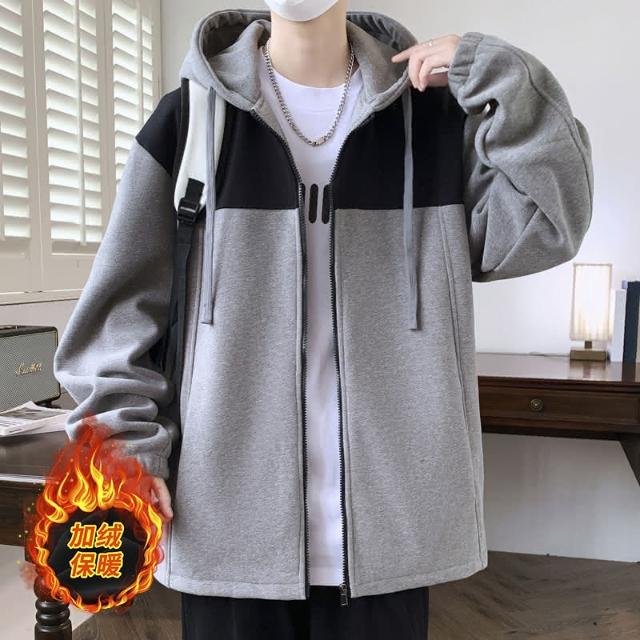 連帽休閑衛衣 奧粒絨開衫衛衣男 男士拼接保暖上衣 大學T 加絨加厚外套衛衣 男帽T 帅气连帽衛衣 青少年上衣