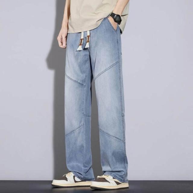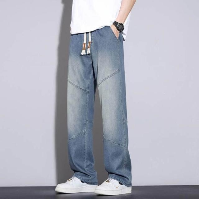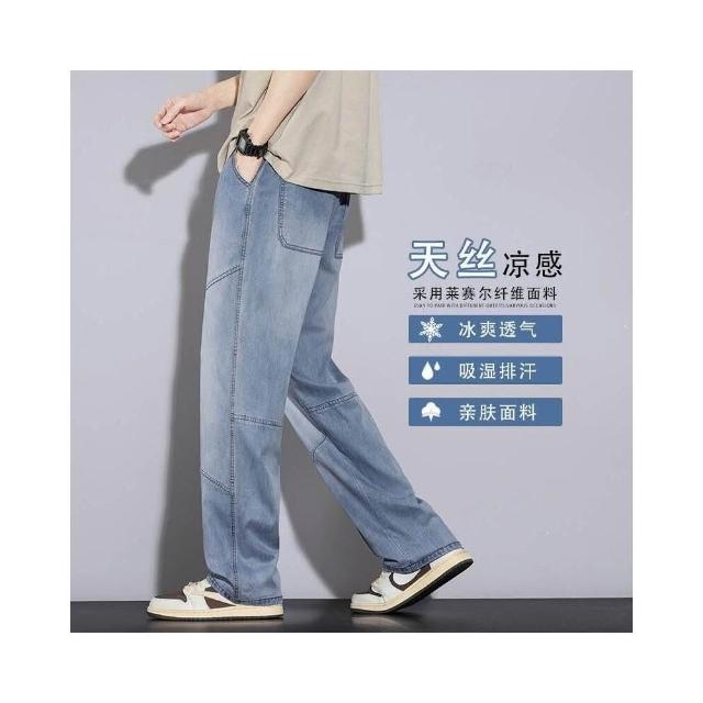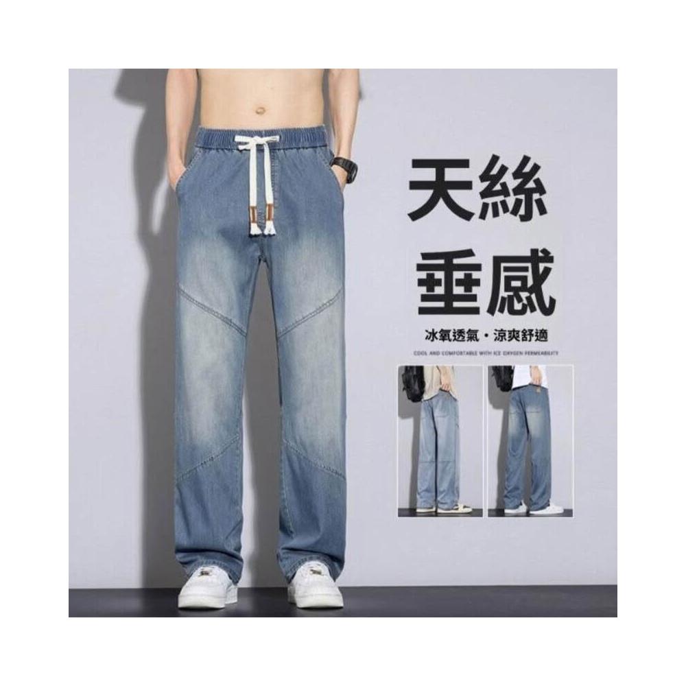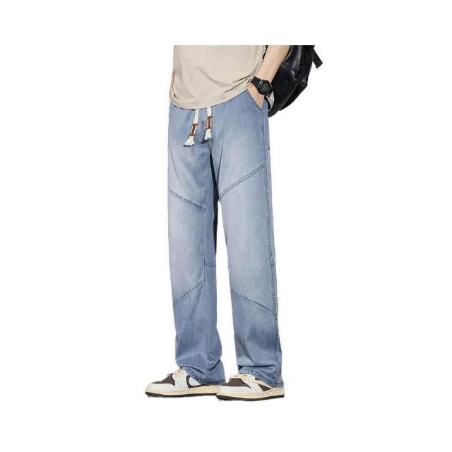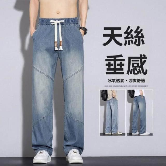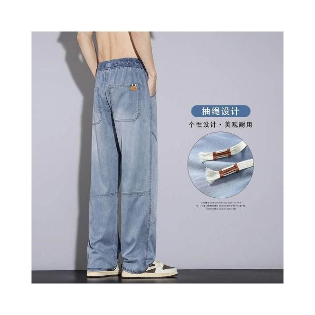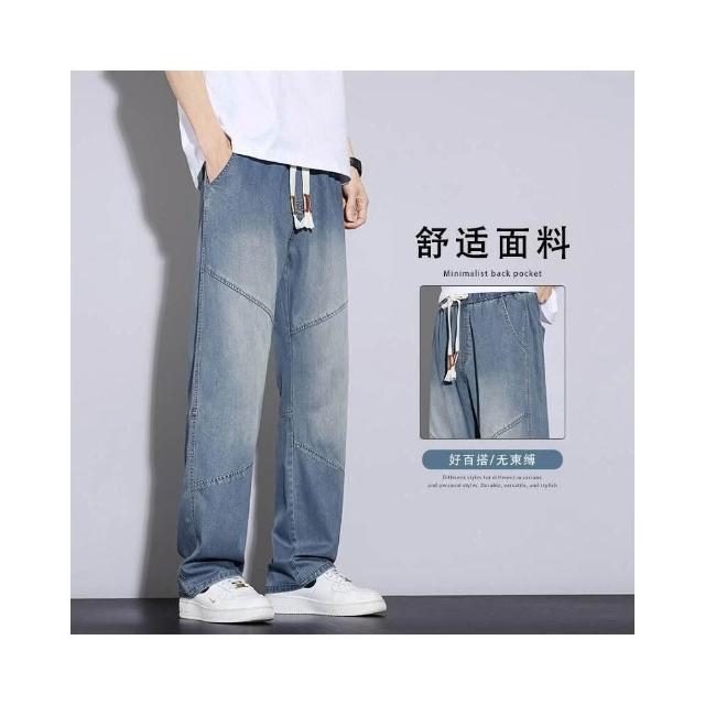 牛仔褲萊賽爾天絲男士潮流夏季薄款美式寬松長褲男時尚潮牌松緊腰直筒休閑褲男闊腿褲彈力天絲冰絲涼感超薄透氣牛仔褲彈性長褲百搭