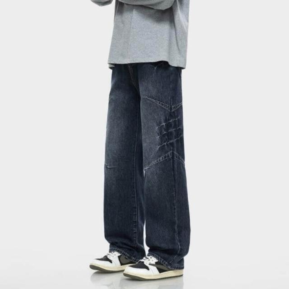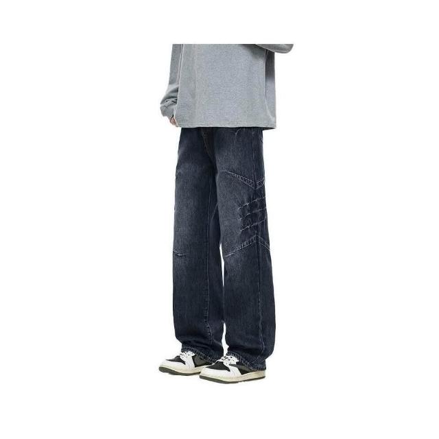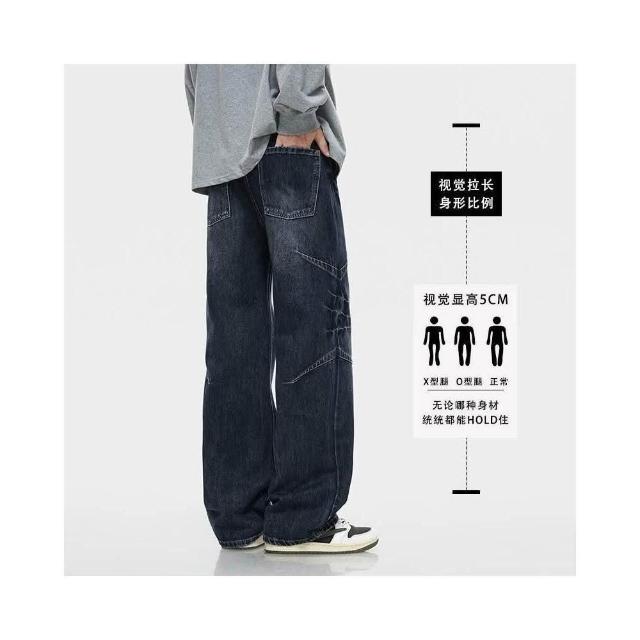 拼接牛仔褲男秋季闊腿垂感寬松直筒褲子痞帥百搭長褲小眾設計感美式高街牛仔休閑褲寬褲大尺碼薄款休閒褲耐磨登山褲垂感韓國彎刀褲