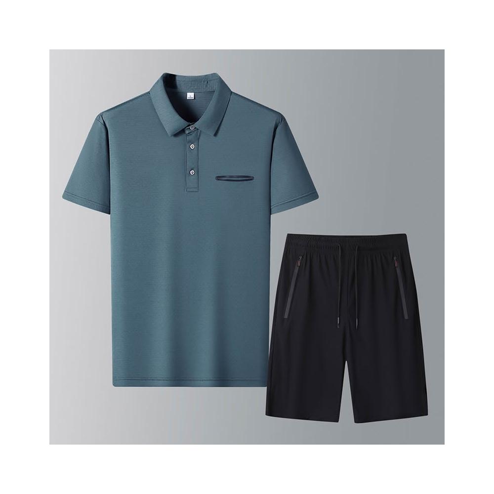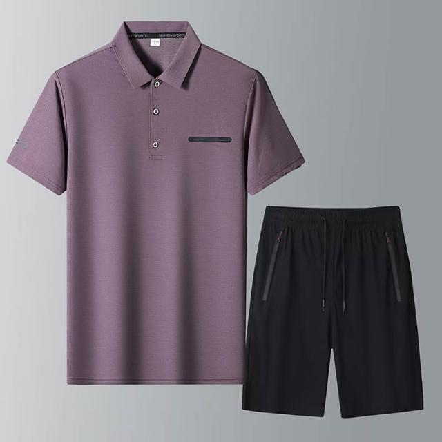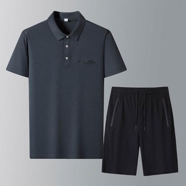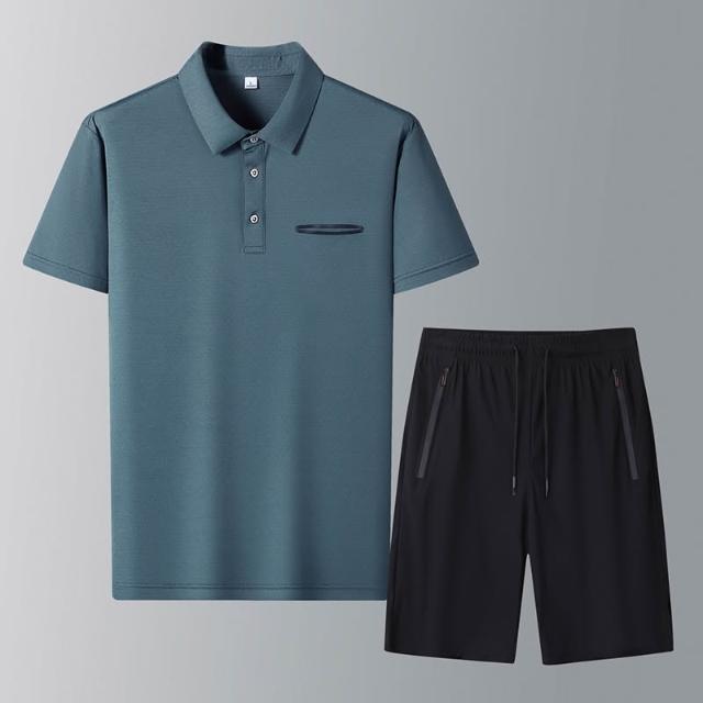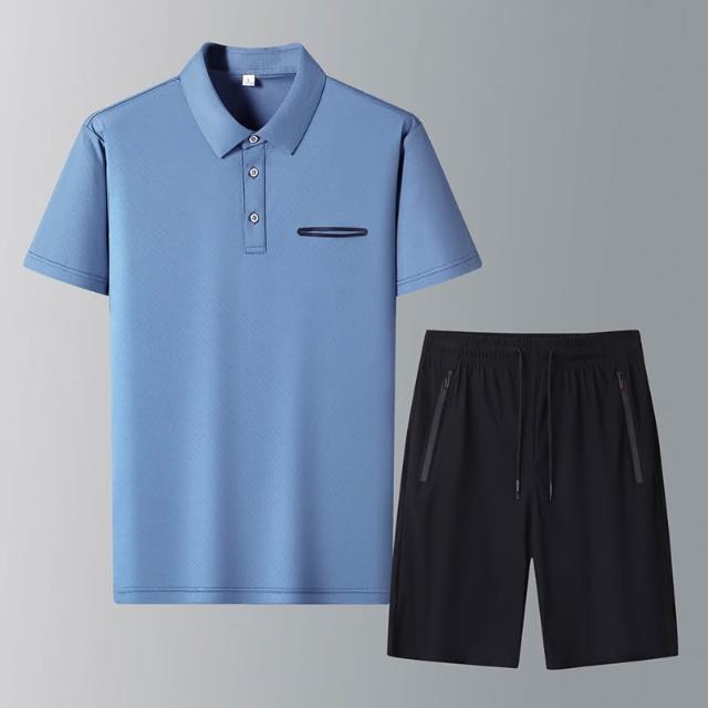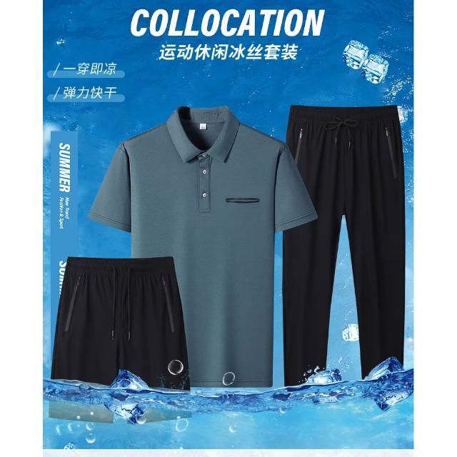 運動套裝男冰絲涼感polo衫短袖上衣男中年爸爸套裝冰絲短褲夏天寬鬆休閒套裝速乾涼感衣吸濕排汗商務翻領上衣垂感運動短褲男裝