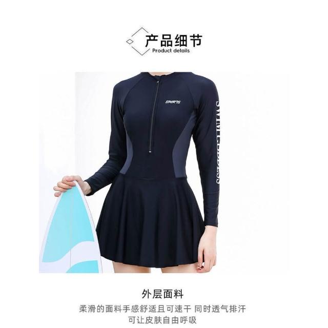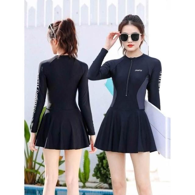 泳衣比基尼速乾防曬泳衣透氣遮肉高彈力大尺碼海邊溫泉度假機能泳衣連體裙式泳衣長袖防曬女士泳裝純色拼接拉鏈款保守顯瘦泳裝女生