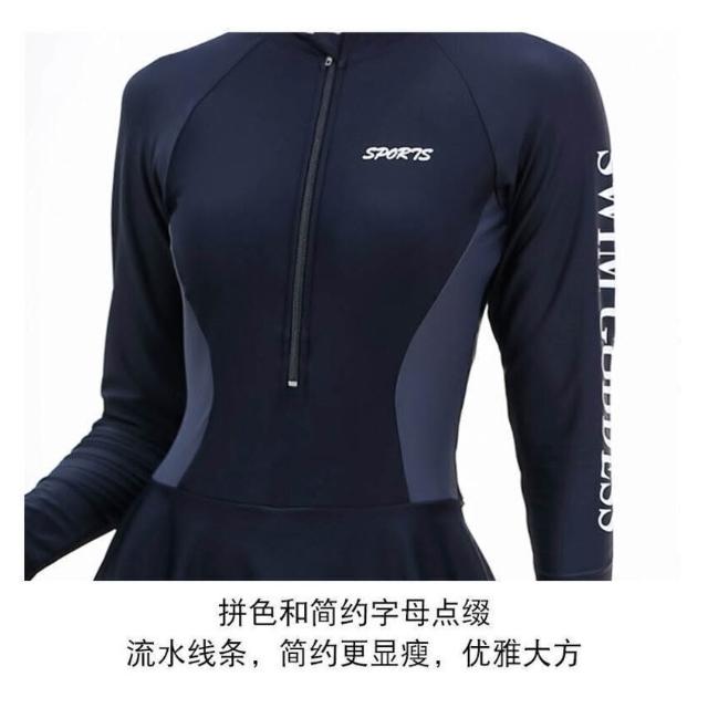 泳衣比基尼速乾防曬泳衣透氣遮肉高彈力大尺碼海邊溫泉度假機能泳衣連體裙式泳衣長袖防曬女士泳裝純色拼接拉鏈款保守顯瘦泳裝女生