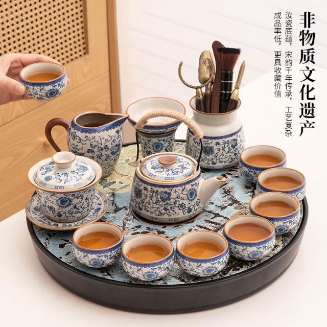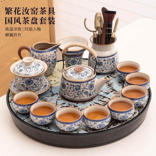 小戶型家用汝窯陶瓷 功夫茶具 茶臺一整套手抓提梁茶壺茶杯茶盤套裝 MMLD10244D