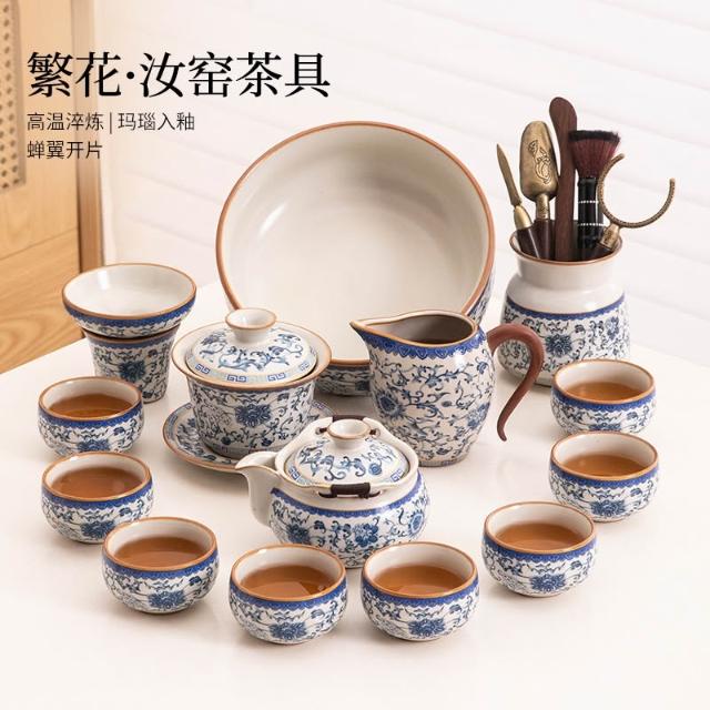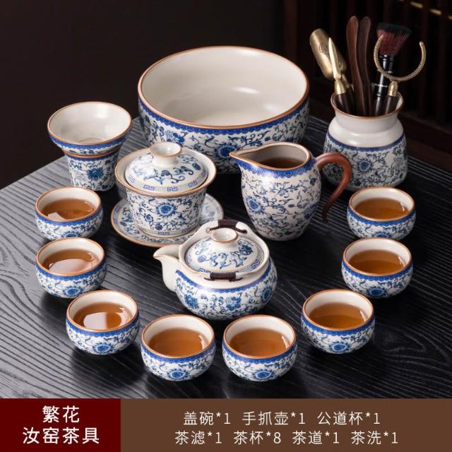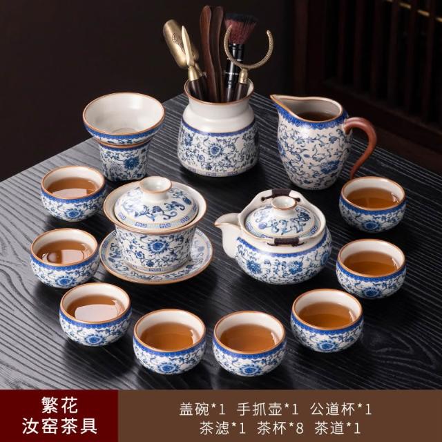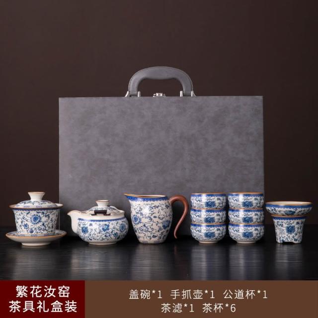 2025新款青花汝窯功夫茶具套裝 家用陶瓷 手抓壺蓋碗茶壺茶杯禮盒裝 MMLD10244D