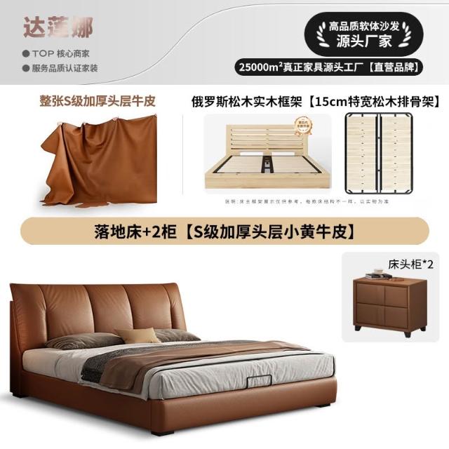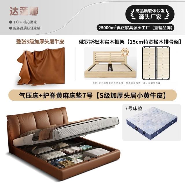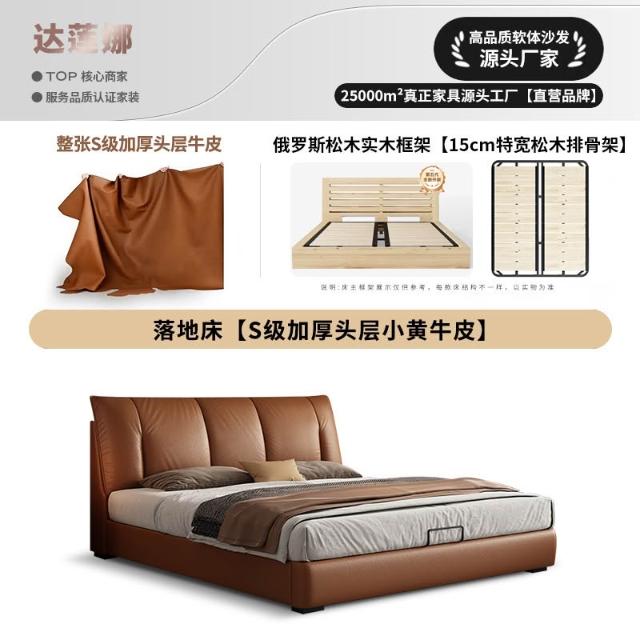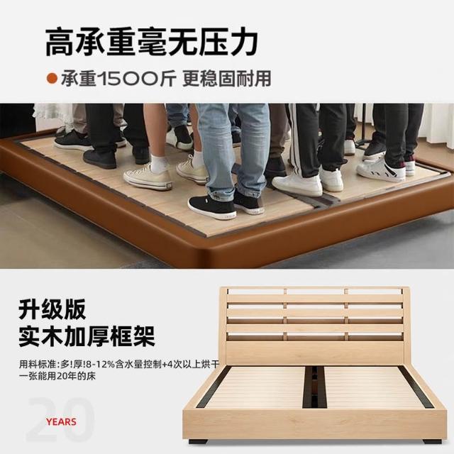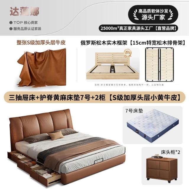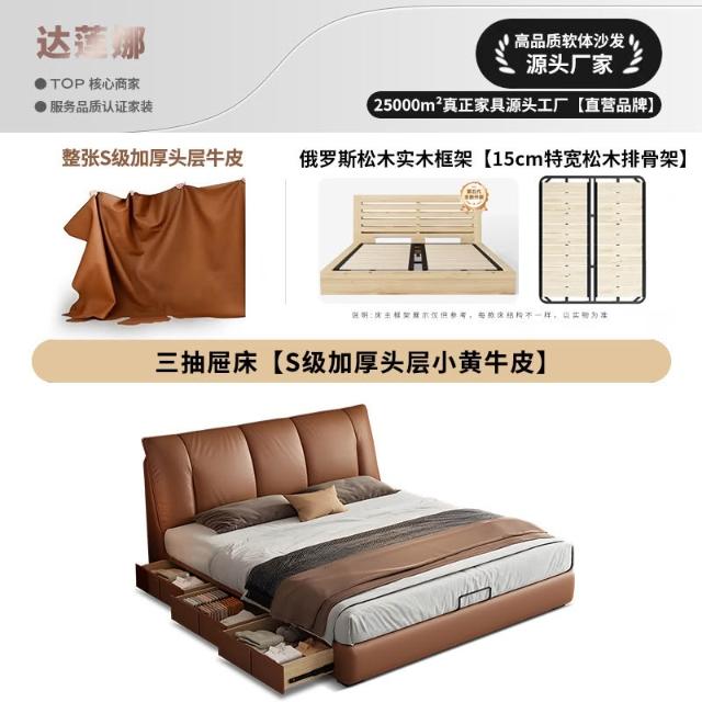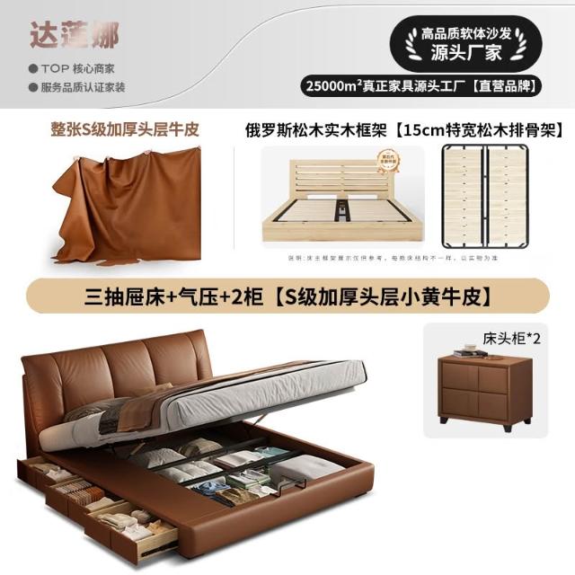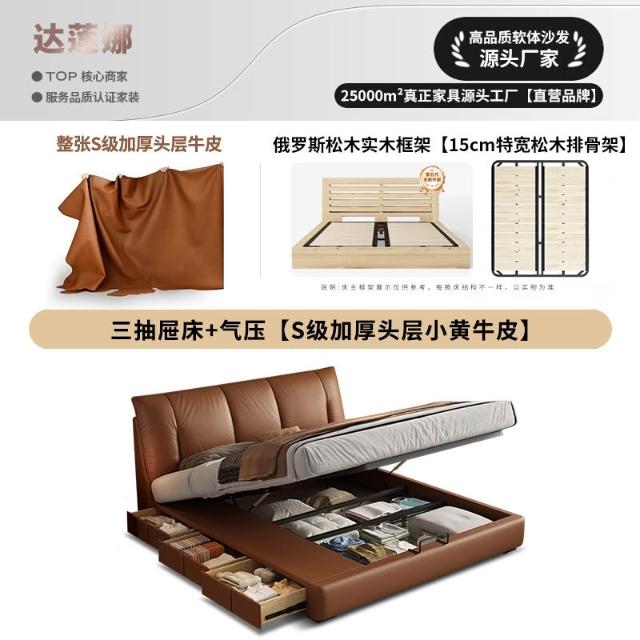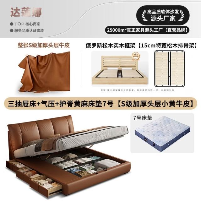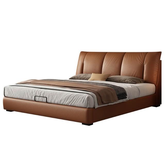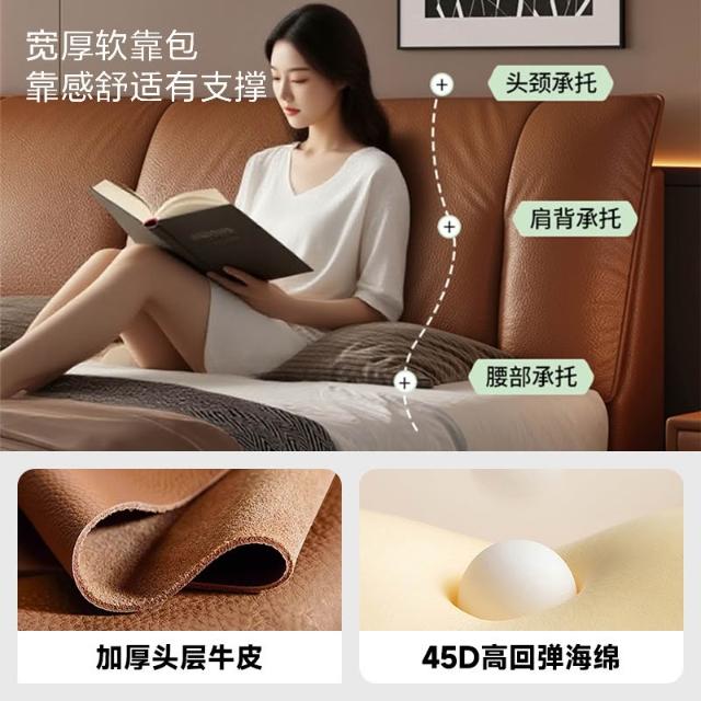 意式極簡真皮床頭層牛皮高端主臥1米8婚床高箱收納雙人軟包儲物床 MLDD251212DD
