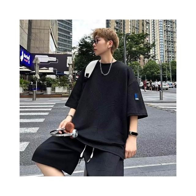 上衣褲子男寬鬆百搭短袖短夏天輕薄透氣t恤男夏季吸濕排汗運動短褲兩件式套裝提花休閒短袖男寬鬆休閒短褲男美式高街穿搭男五分褲