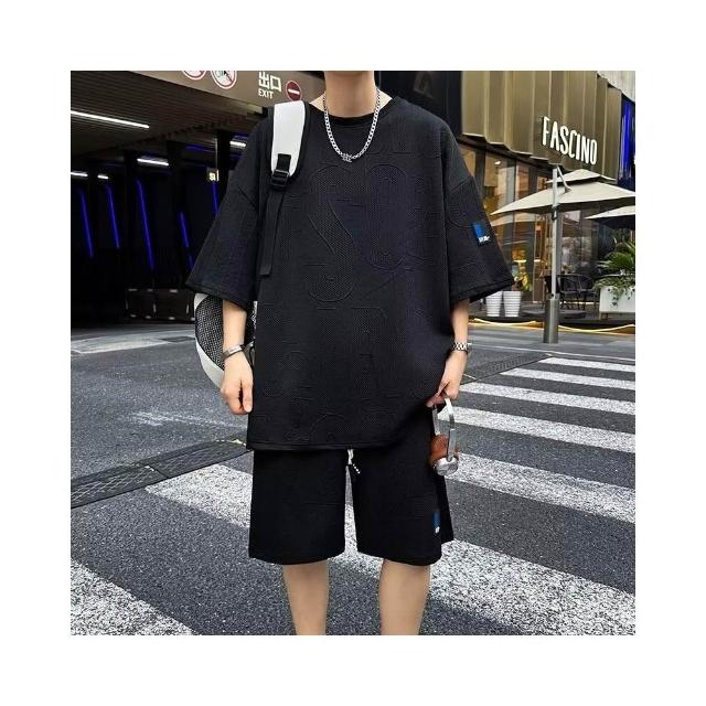 上衣褲子男寬鬆百搭短袖短夏天輕薄透氣t恤男夏季吸濕排汗運動短褲兩件式套裝提花休閒短袖男寬鬆休閒短褲男美式高街穿搭男五分褲