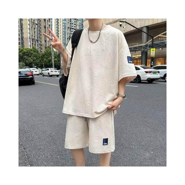 上衣褲子男寬鬆百搭短袖短夏天輕薄透氣t恤男夏季吸濕排汗運動短褲兩件式套裝提花休閒短袖男寬鬆休閒短褲男美式高街穿搭男五分褲