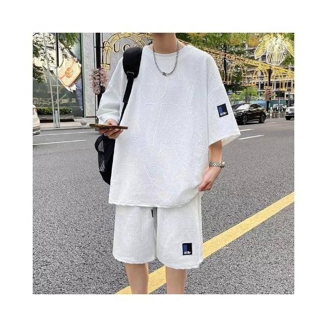 上衣褲子男寬鬆百搭短袖短夏天輕薄透氣t恤男夏季吸濕排汗運動短褲兩件式套裝提花休閒短袖男寬鬆休閒短褲男美式高街穿搭男五分褲