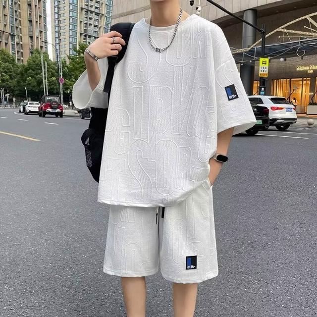 上衣褲子男寬鬆百搭短袖短夏天輕薄透氣t恤男夏季吸濕排汗運動短褲兩件式套裝提花休閒短袖男寬鬆休閒短褲男美式高街穿搭男五分褲