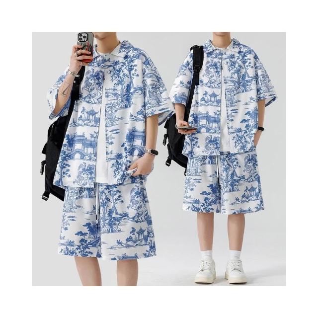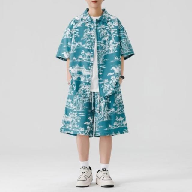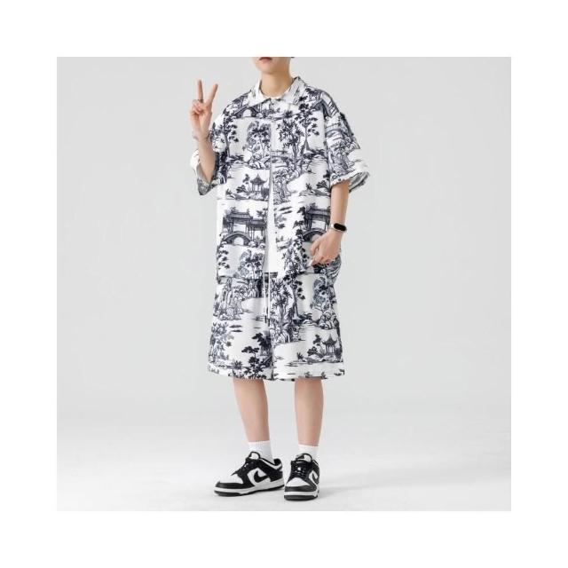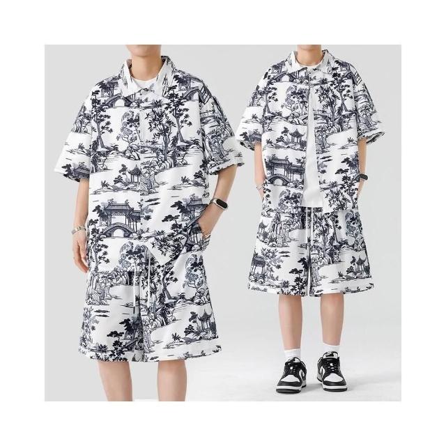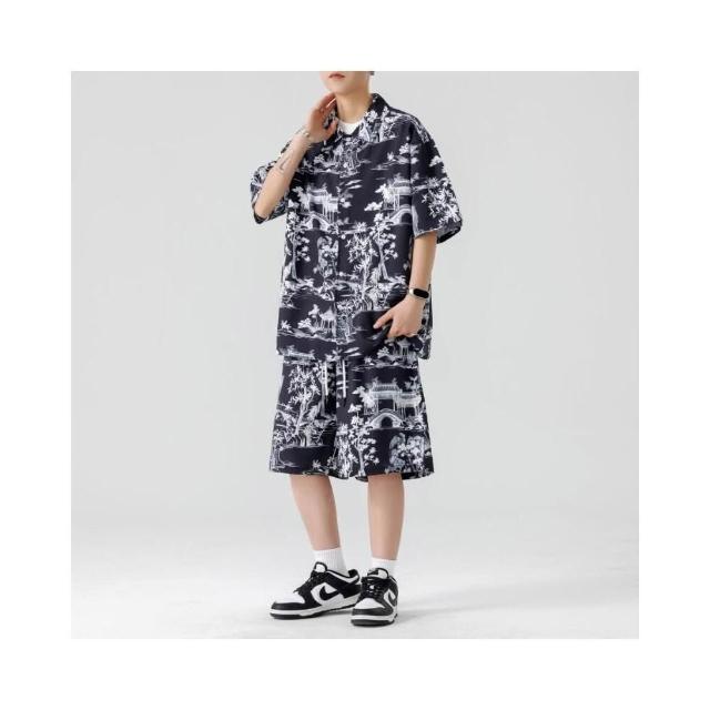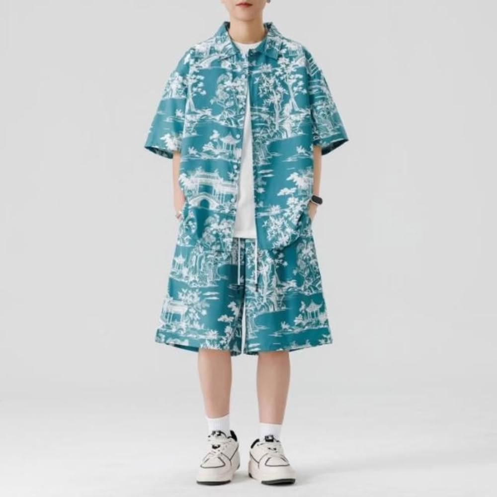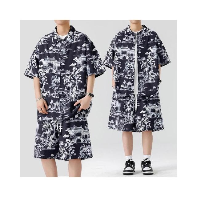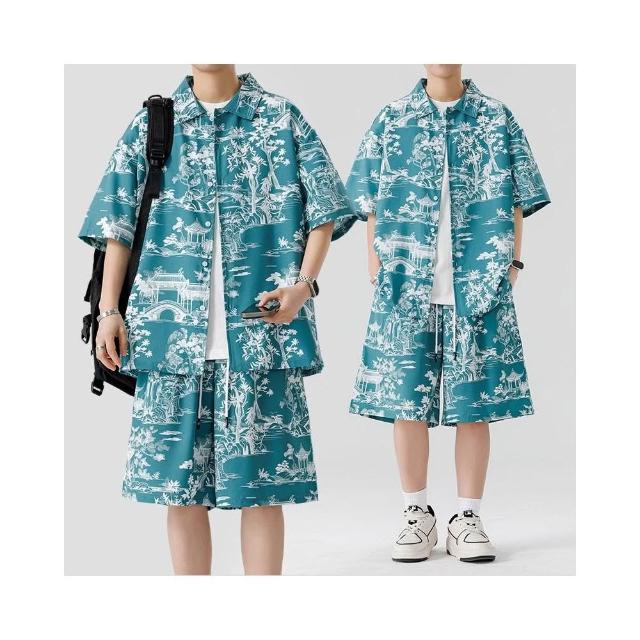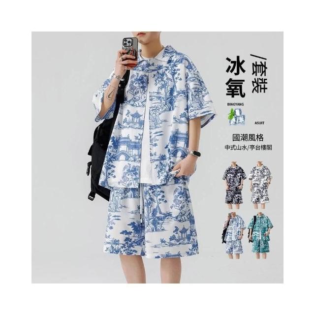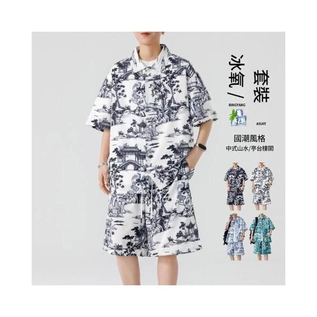 M-3XL 新款熱賣 涼感衣 夏威夷 印花 沙灘 套裝男 帥氣 潮流 短袖 襯衫 短褲 大尺碼 花襯衫 短袖 短褲 兩件裝