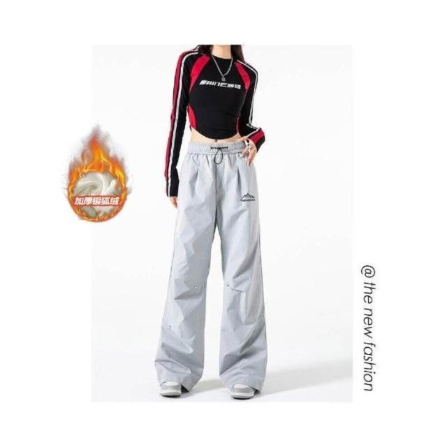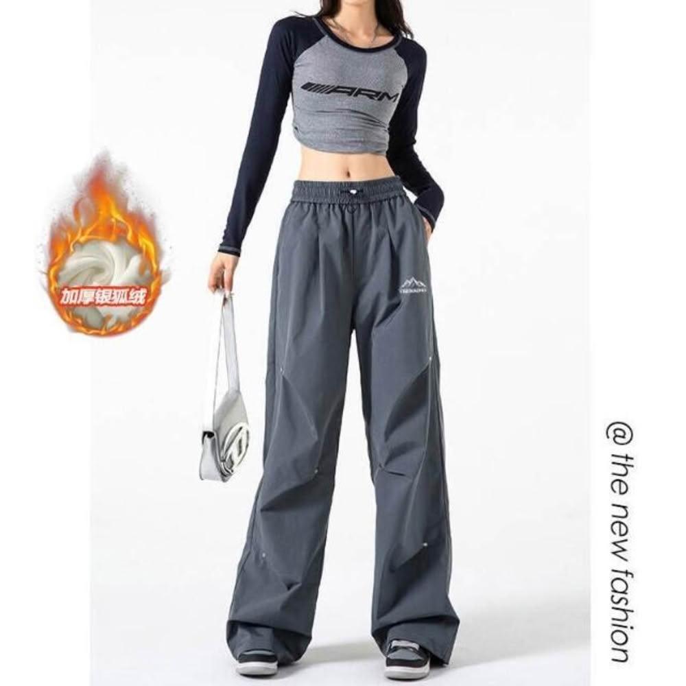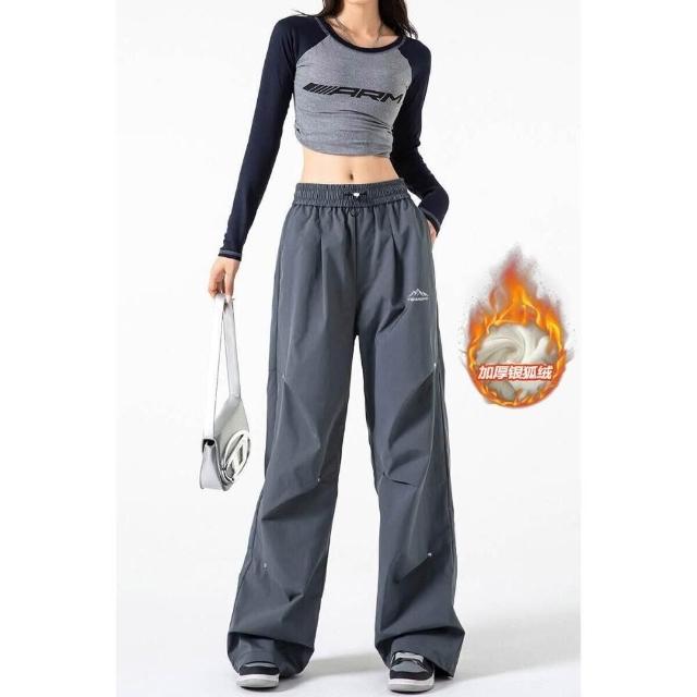 衝鋒褲刷毛褲復古寬松降落傘兵褲男加絨銀狐絨大尺碼拖地褲休閒褲女高腰顯瘦長褲女闊腿褲寬褲女落地褲直筒休閒長褲彎刀褲女