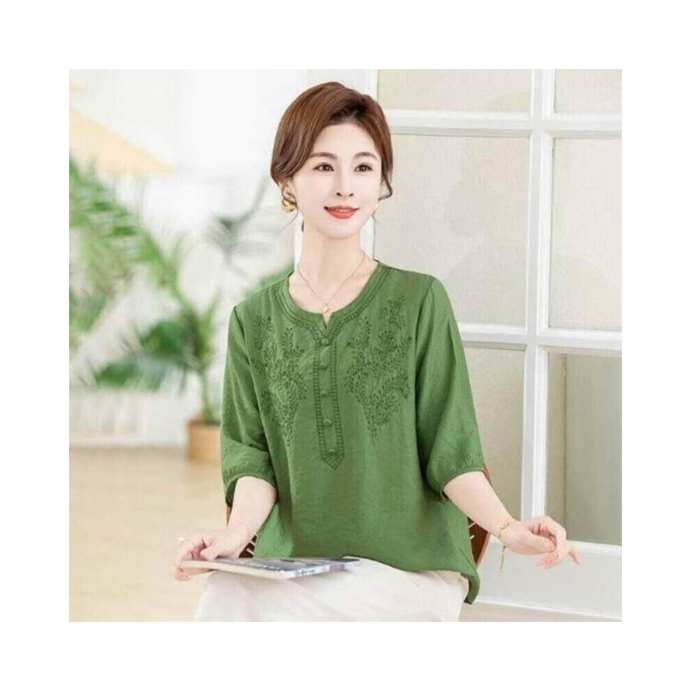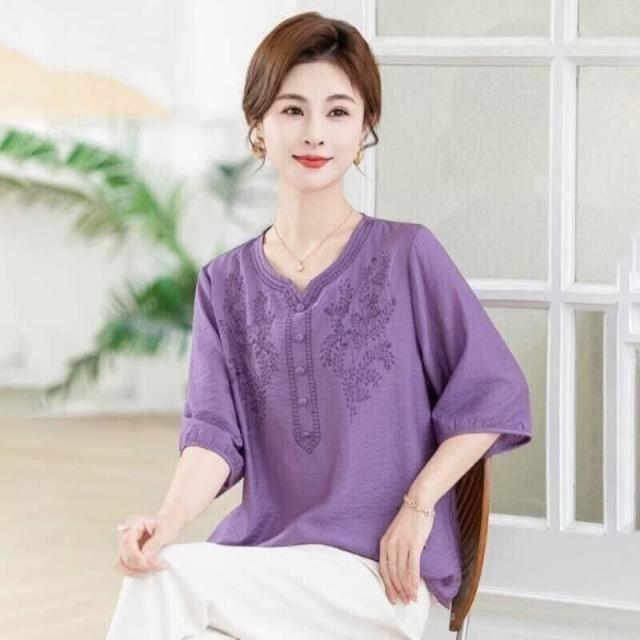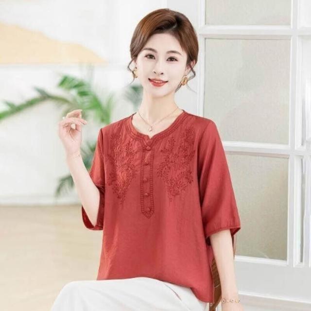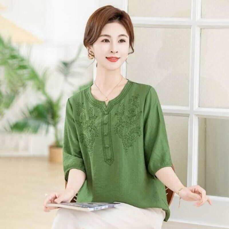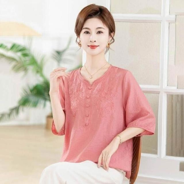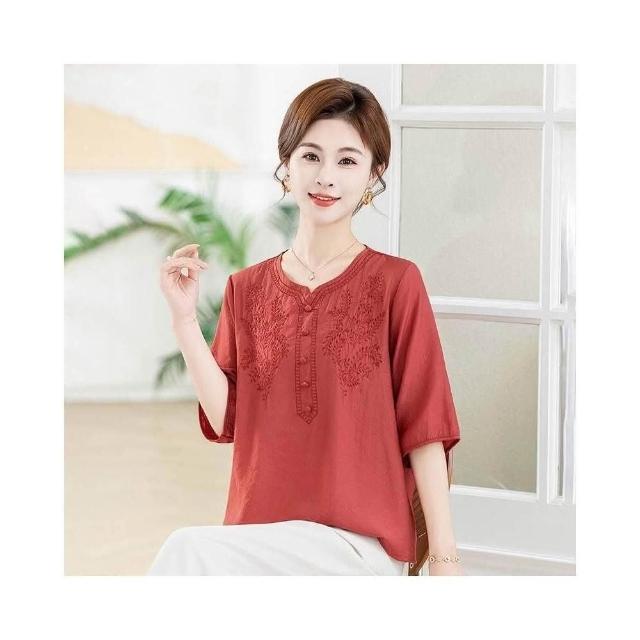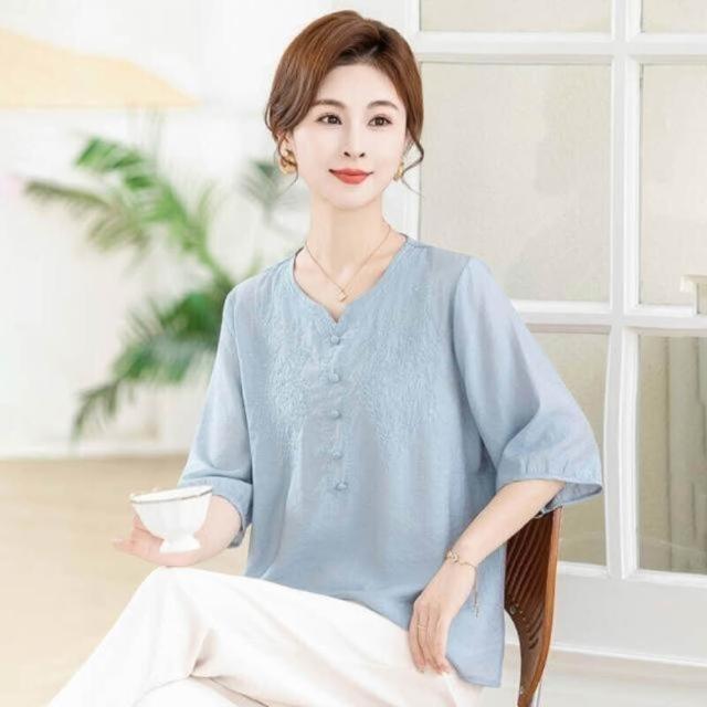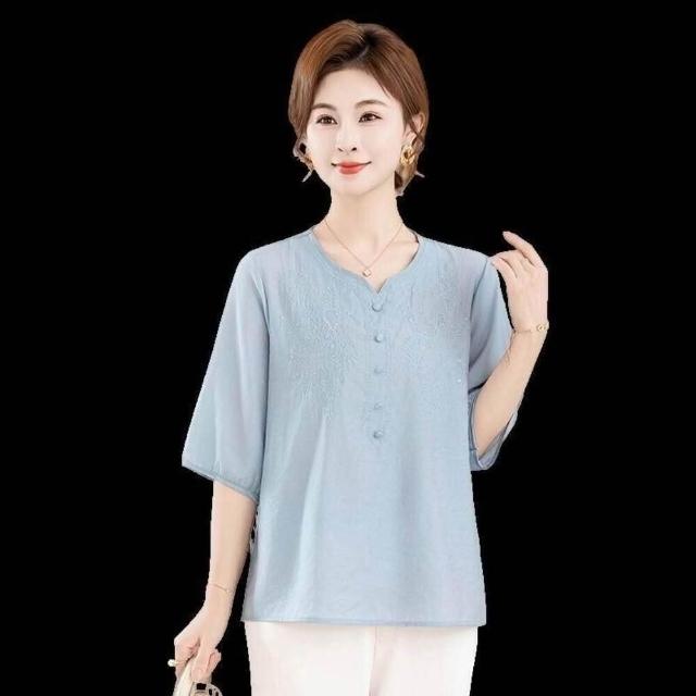 涼感衣女冰絲襯衫透氣速乾抗UV防曬顯瘦寬鬆夏季日常百搭上衣優雅百搭高品質洋氣顯瘦媽媽裝舒適透氣刺繡寬松中袖中式V領小衫媽媽穿搭洋裝上衣涼感小衫
