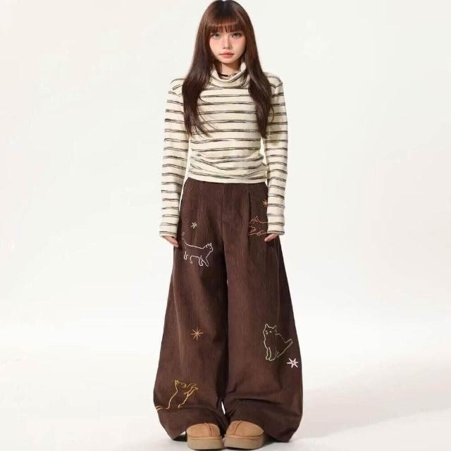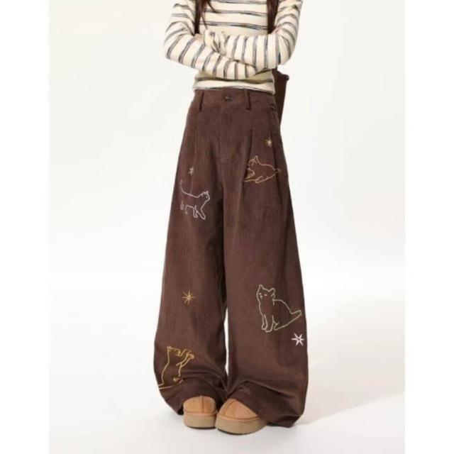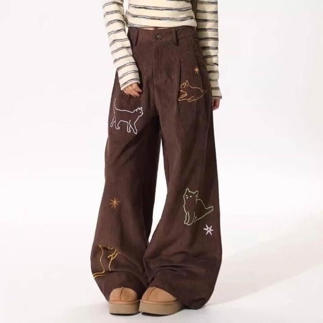 牛仔褲彎刀褲男女同款復古棕色燈芯絨牛仔褲長褲女寬松闊腿貓咪刺繡休閑褲彎刀褲直筒褲闊腿褲緊身褲修身褲煙管褲喇叭褲微喇褲寬鬆褲九分褲長褲