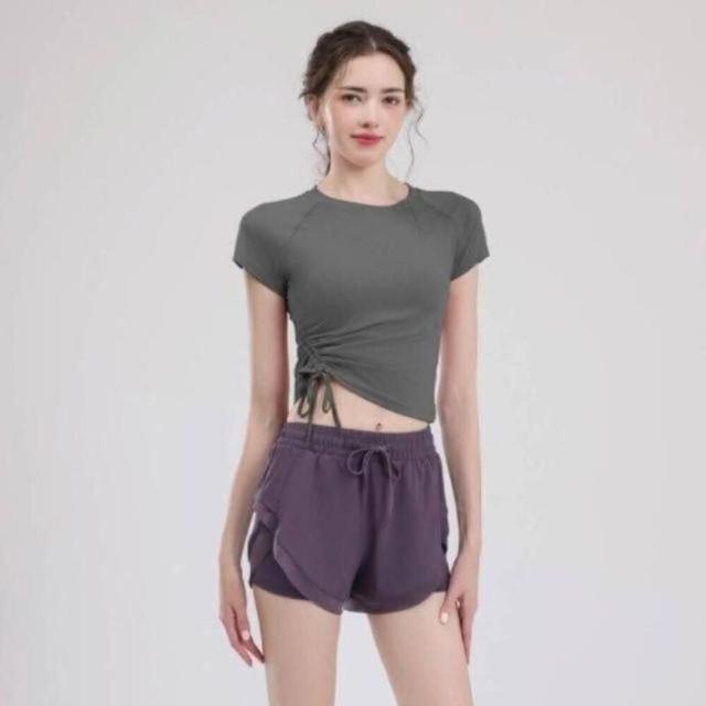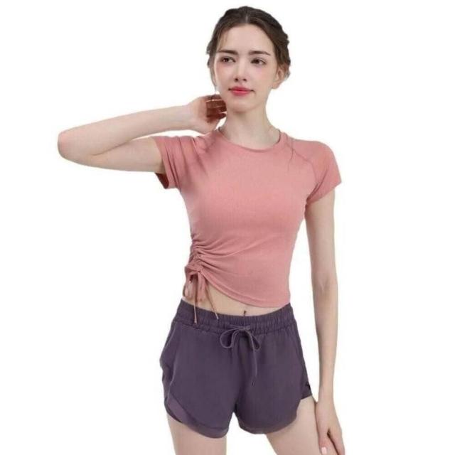 涼感衣女短袖T恤女上衣瑜伽服運動健身服空調服速乾衣冰絲衣運動套裝新款瑜伽服女抽繩緊身運動短袖跑步兩件套健身速幹短褲