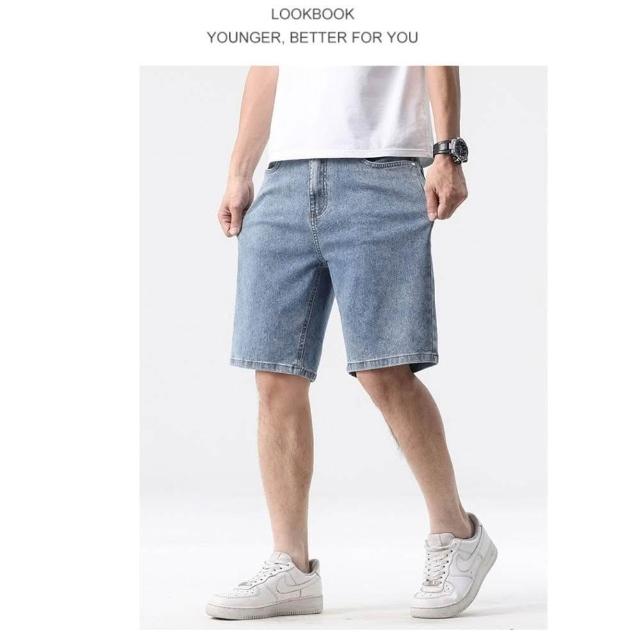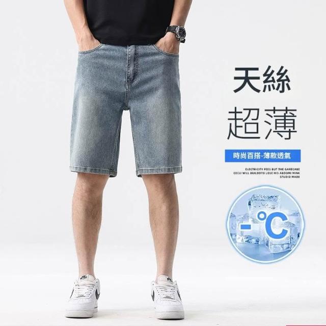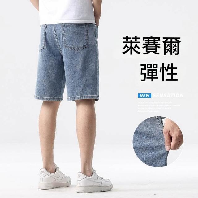 牛仔褲男短褲天絲彈性工作短褲大尺碼涼感寬褲輕薄透氣寬鬆短褲5分褲薄款低腰休閒短褲男冰絲五分紐扣牛仔闊腿褲口袋工裝褲男牛仔