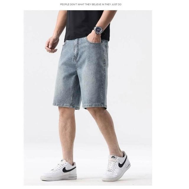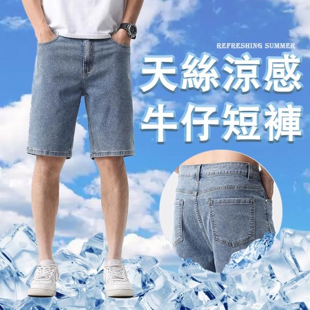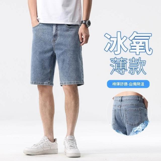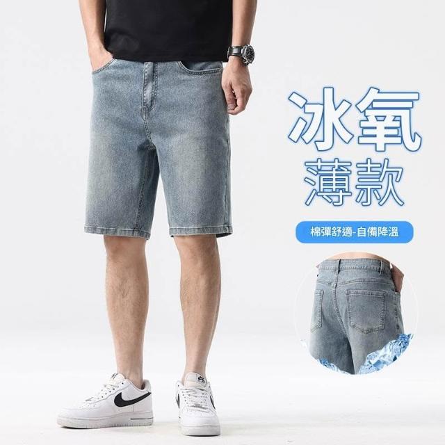 牛仔褲男短褲天絲彈性工作短褲大尺碼涼感寬褲輕薄透氣寬鬆短褲5分褲薄款低腰休閒短褲男冰絲五分紐扣牛仔闊腿褲口袋工裝褲男牛仔