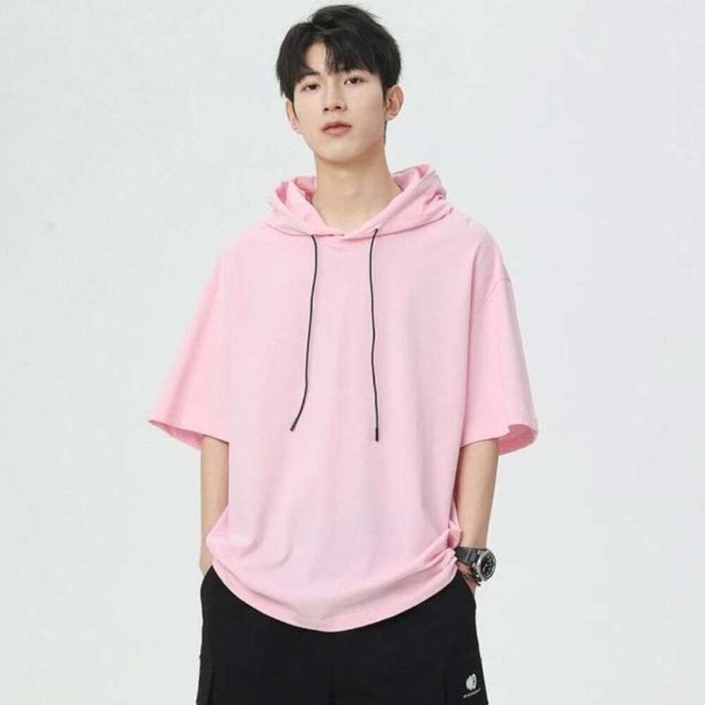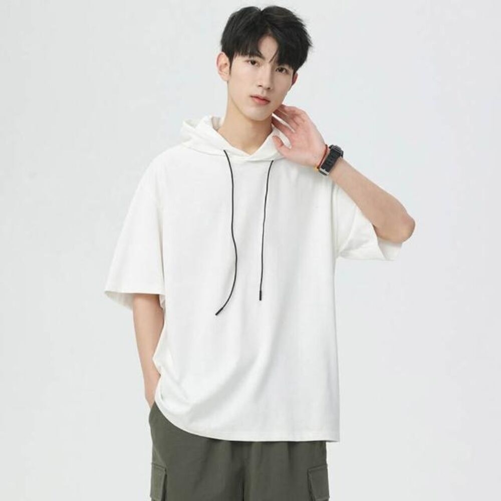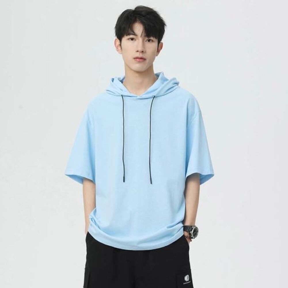 帽t男美式重磅運動短袖連帽t恤寬鬆涼感透氣T恤休閒上衣潮流時尚男裝垂順短袖T恤大童夏季百搭吸濕排汗半袖帽衫柔軟舒適薄短袖
