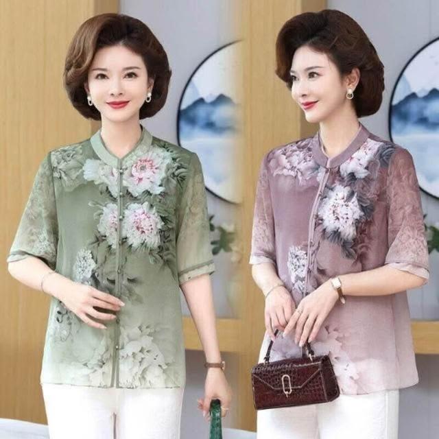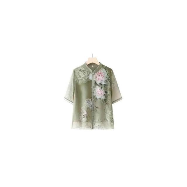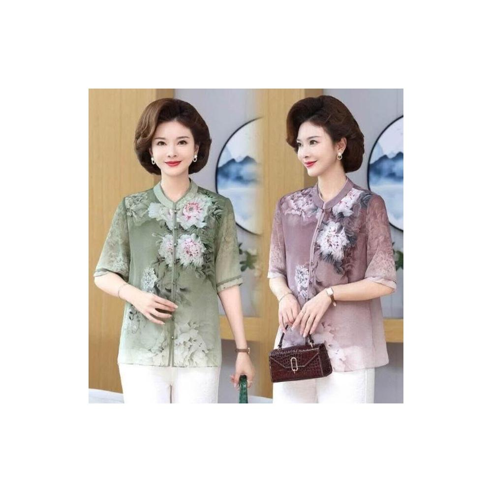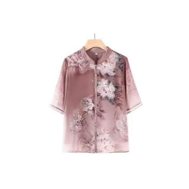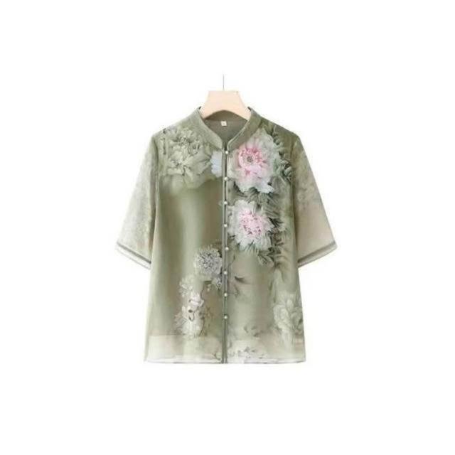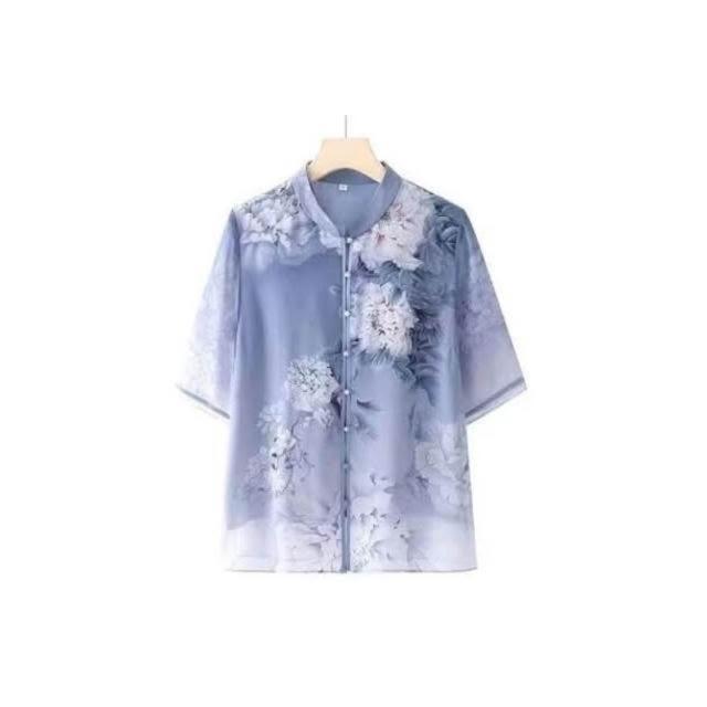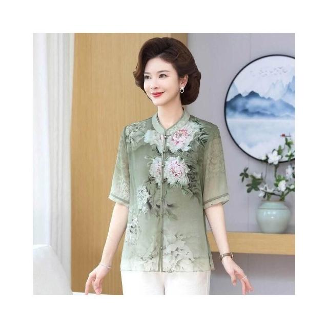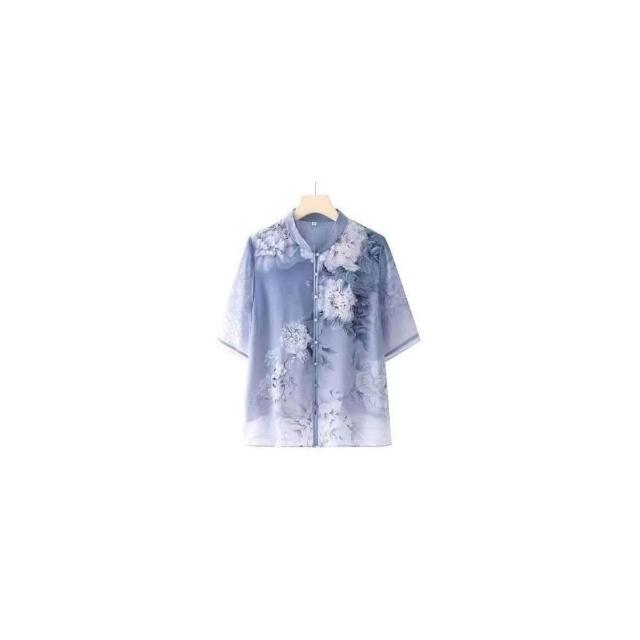 涼感衣女冰絲襯衫透氣速乾抗UV防曬顯瘦寬鬆夏季優雅中老年女士夏季薄款花卉圖案短袖襯衫大碼寬松上衣顯氣質媽媽穿搭洋裝上衣涼感小衫