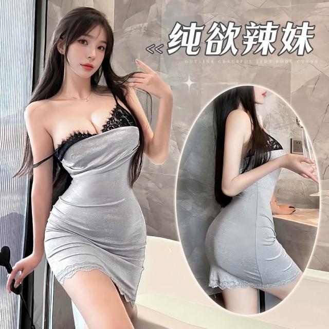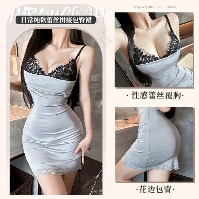純欲辣妹蕾絲拼接包臀連身睡裙-灰黑 (睡衣_睡裙_女睡衣_性感睡衣_情趣睡衣)