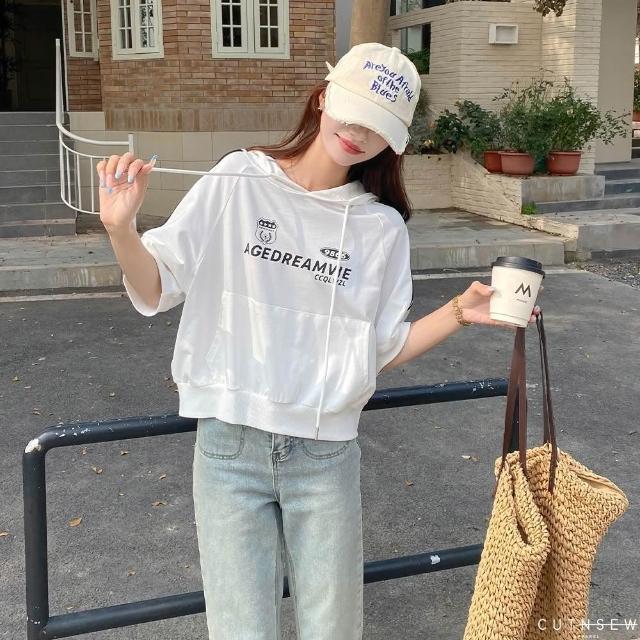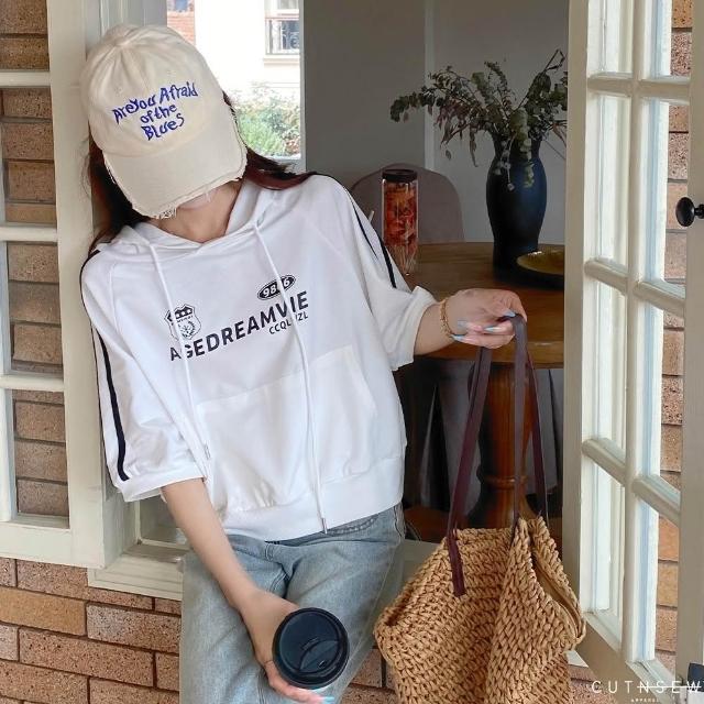 CUTNSEW 63716 現貨 美式休閒連帽五分袖上衣 (女裝 短袖 春夏 寬鬆 寬版 帽T 上衣 短版)