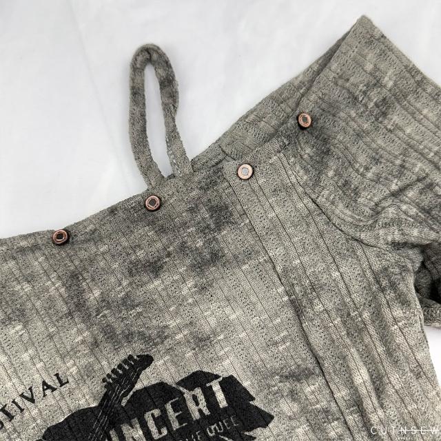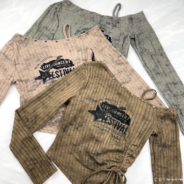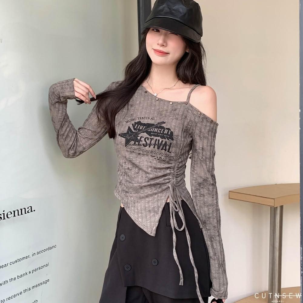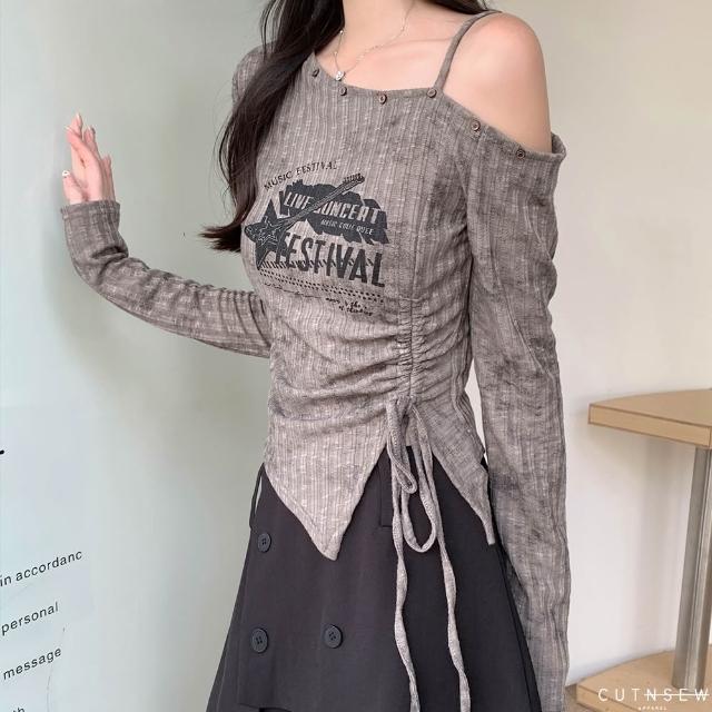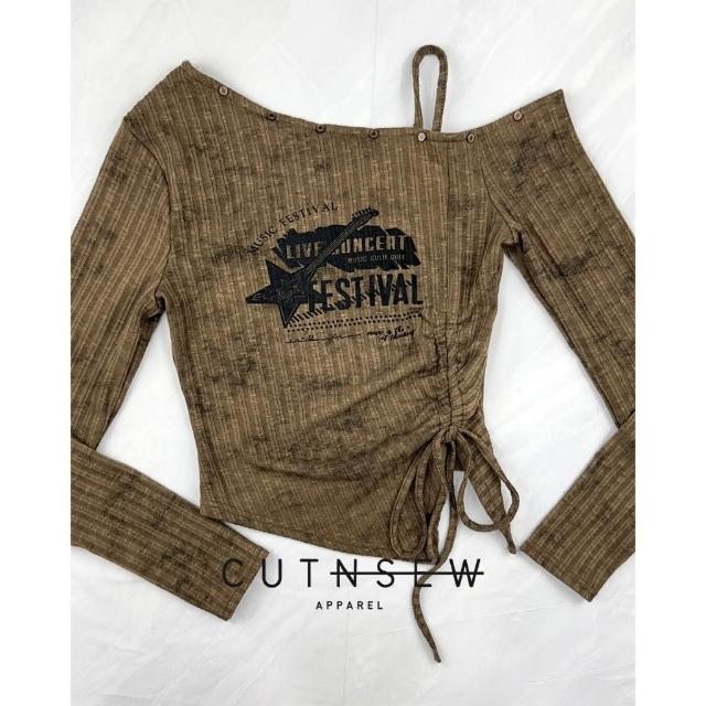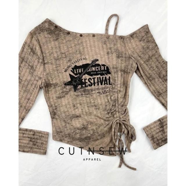 UTNSEW 【69604現貨 斜肩綁帶合身上衣 印花上衣 淑女 合身 上衣女 收腰 顯瘦 秋冬 長袖 個性穿搭