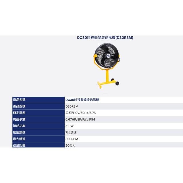 30吋DC移動渦流送風機 七段風速 D30R3M 強力送風 大風量風扇 移動式風扇 工廠必備 倉庫降溫 送風機 最新款