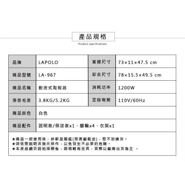 「LAPOLO」直立壁掛 兩用對流式電暖器 LA-967 冷氣團寒流 暖風機 自動斷電設計 居浴兩用 溫暖寒冷冬季 瞬熱