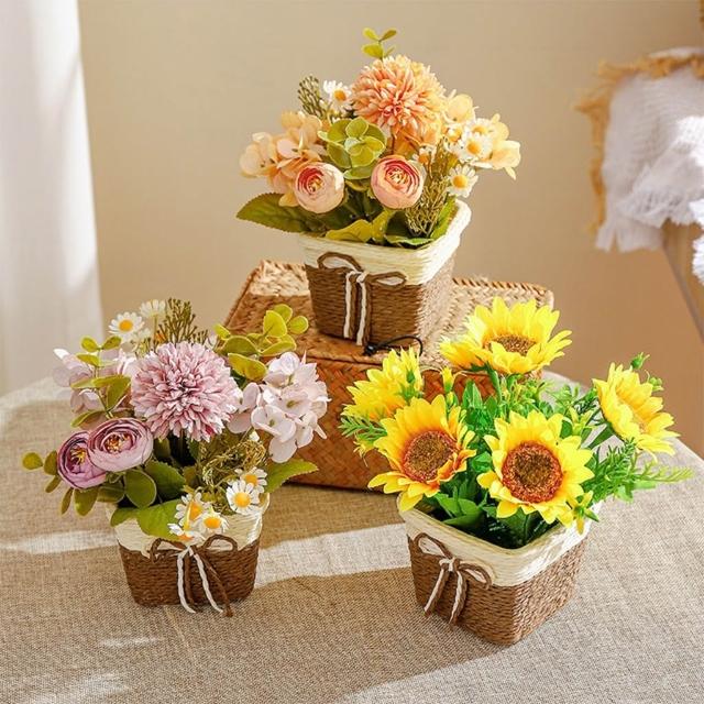 仿真花竹編盆栽田園風 北歐綠化盆栽 仿真植物 花籃 花盆 竹編籃 小盆栽 盆栽 辦公室盆栽 假花樹盆 人造花 園藝